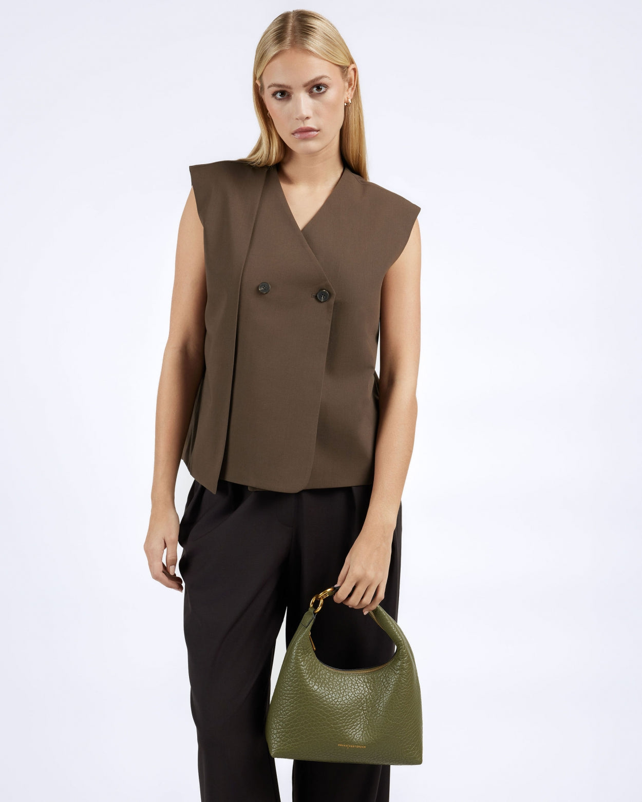 De ARTIE is een crossbody- en handtas in één. Door het ingenieuze ontwerp in bevestiging kun je de lange leren band loskoppelen van de ronde hardware. Deze kun je vervolgens in elkaar klikken zodat je de tas als handtas kunt gebruiken.