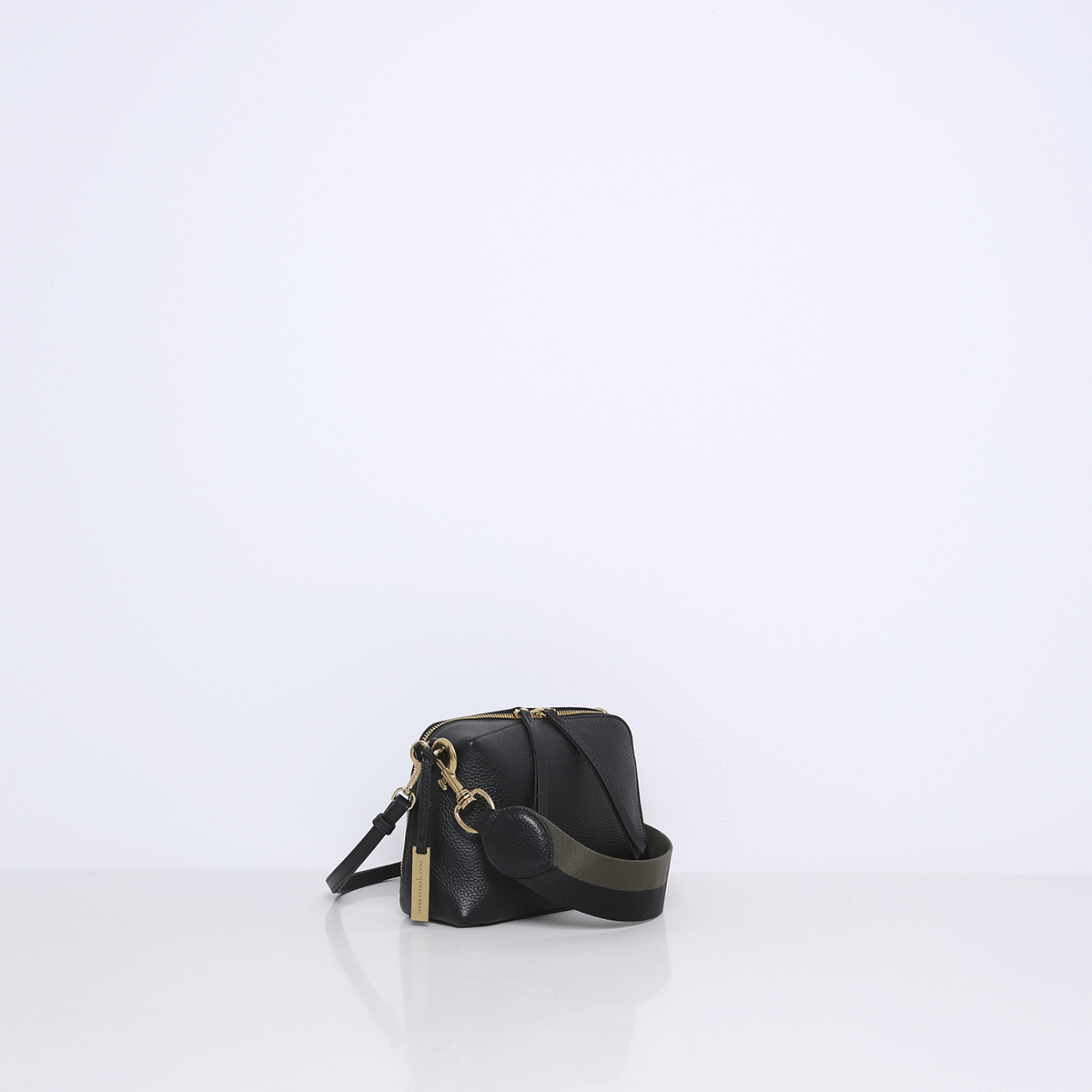 De tas heeft een korte stoffen schouderband met een lengte van 65 cm en een lange leren crossbody band verstelbaar tot 120 cm.