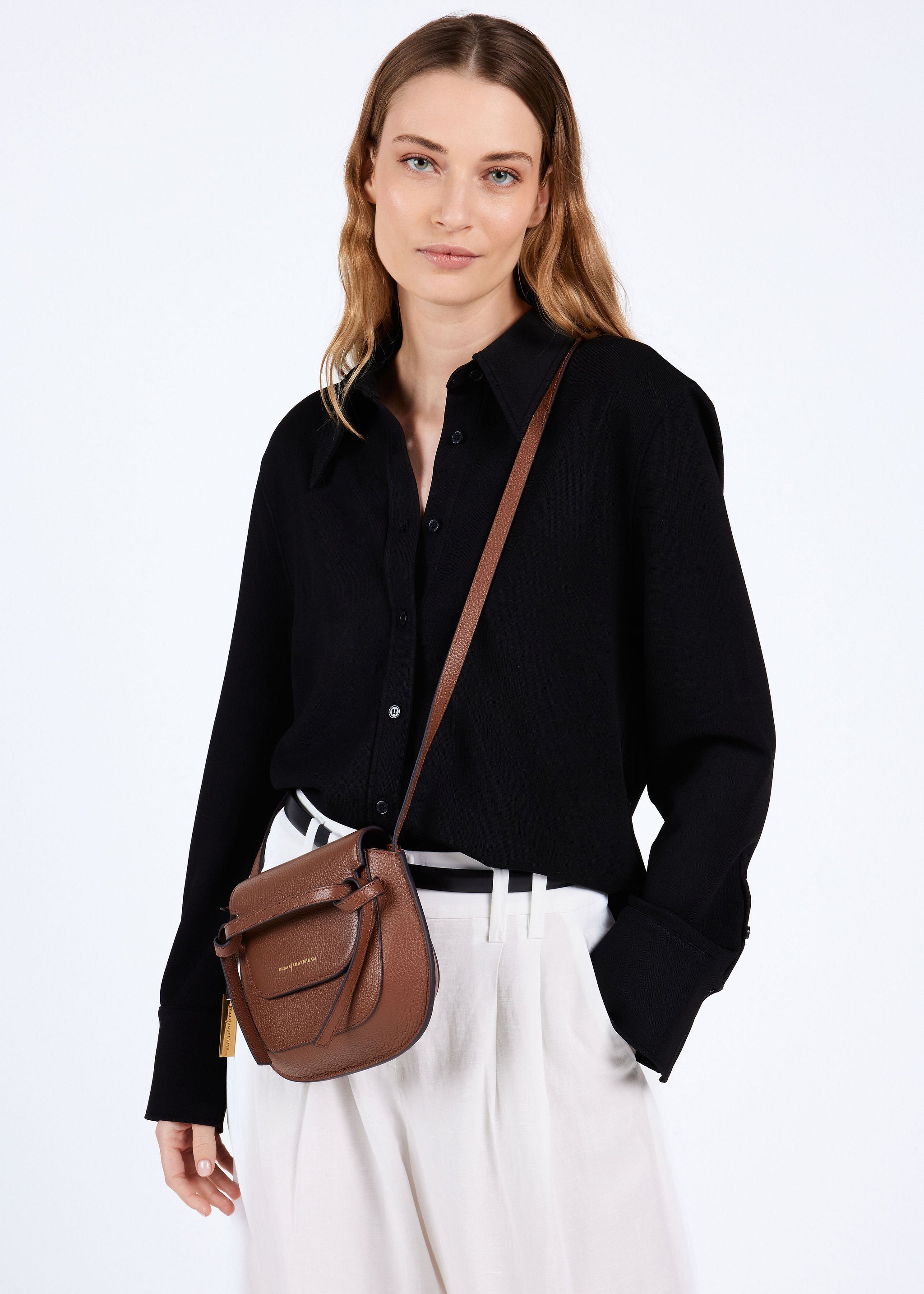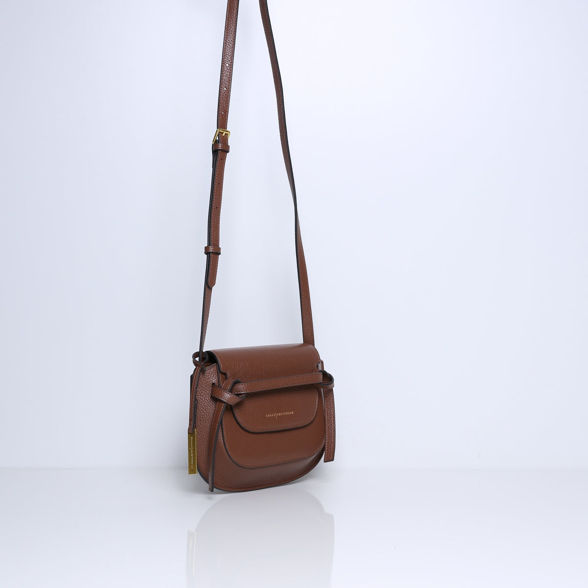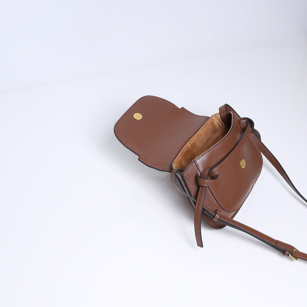 De tas is gemaakt van zacht en soepel rundleer. Beschikt over meerdere binnenvakjes en is gevoerd met stof (viscose). De leren schouderband is verstelbaar in lengte en zit vast aan de tas.