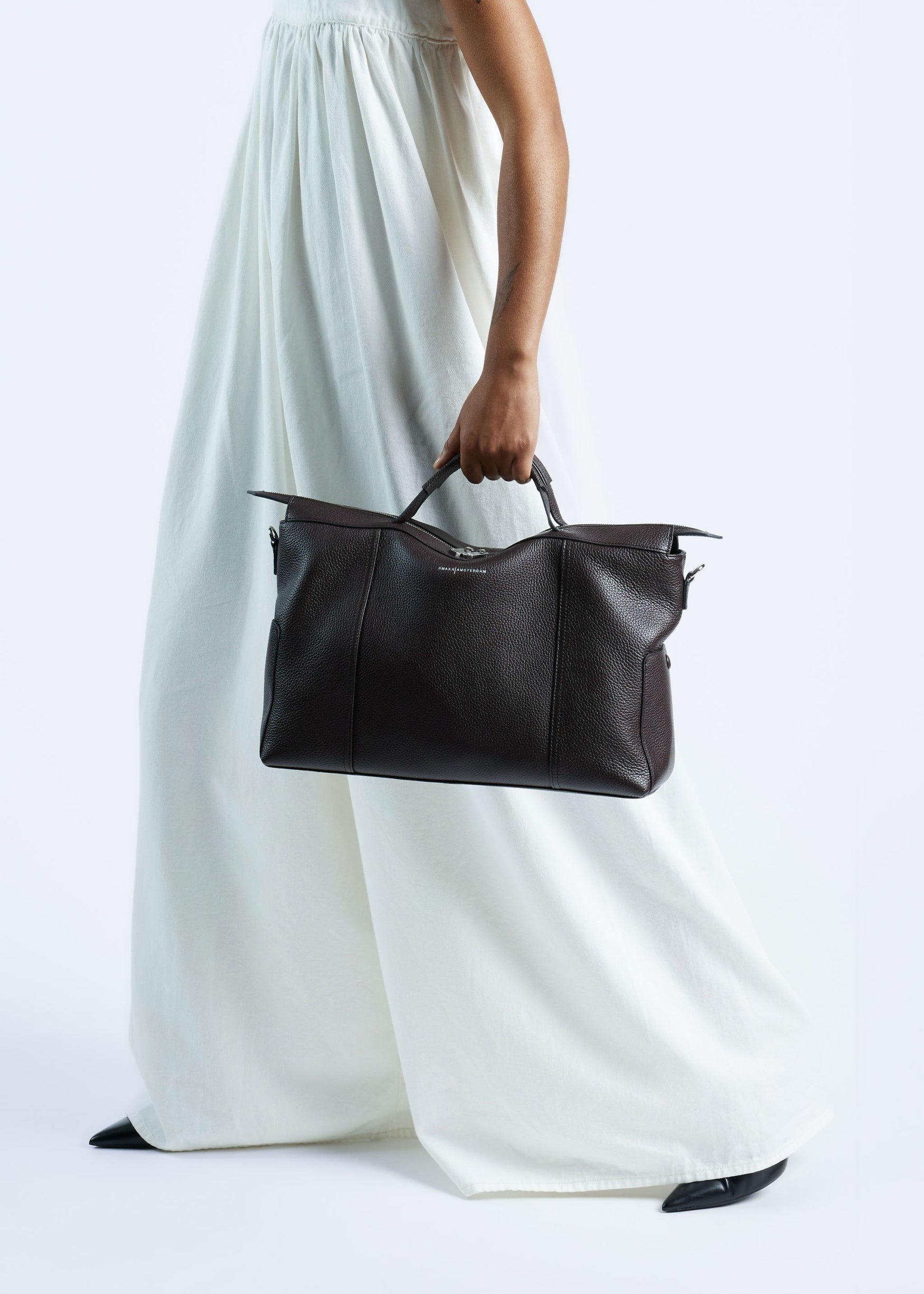De tas is gemaakt van zacht soepel rundleer en is gesloten aan de bovenkant met rits.