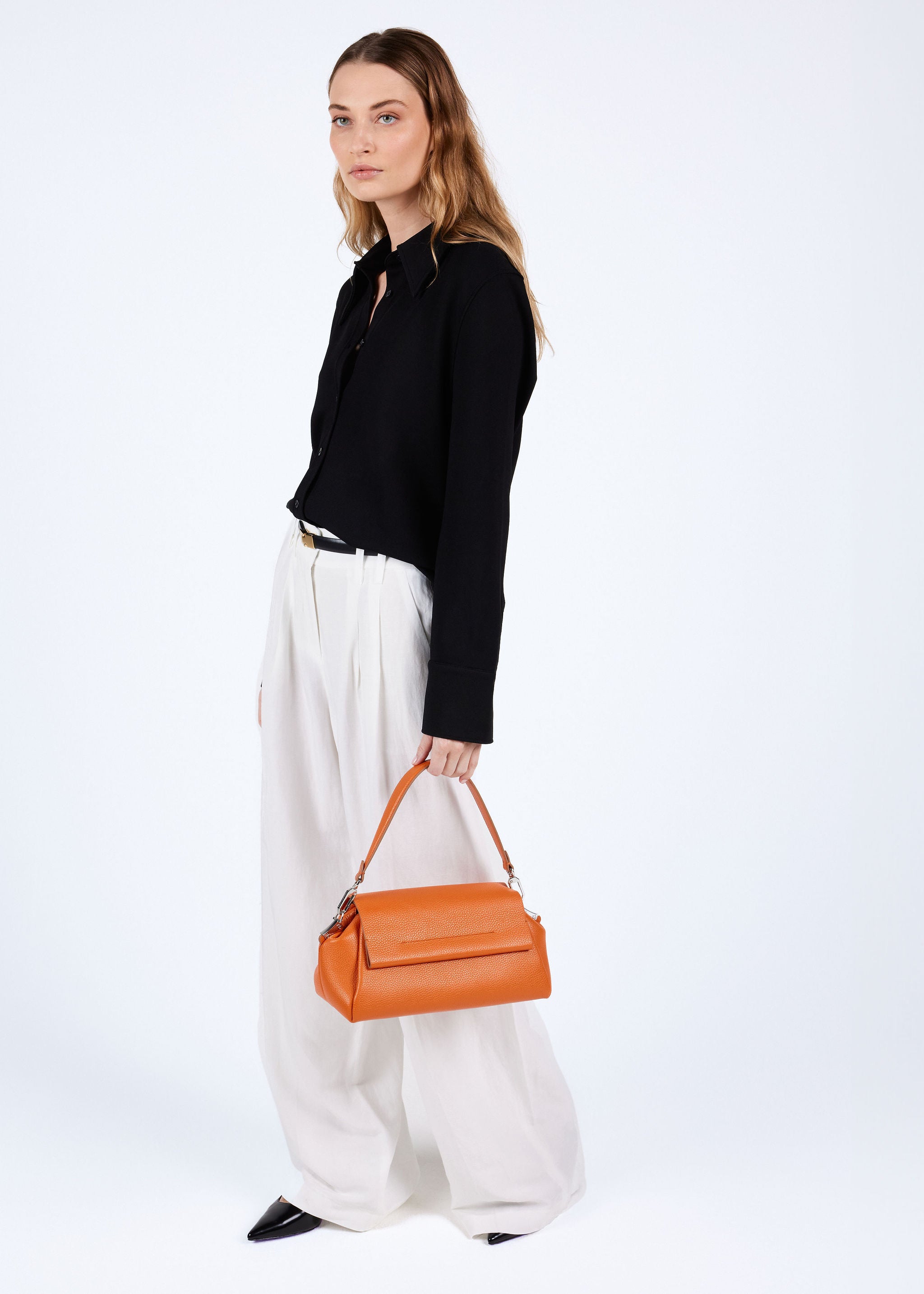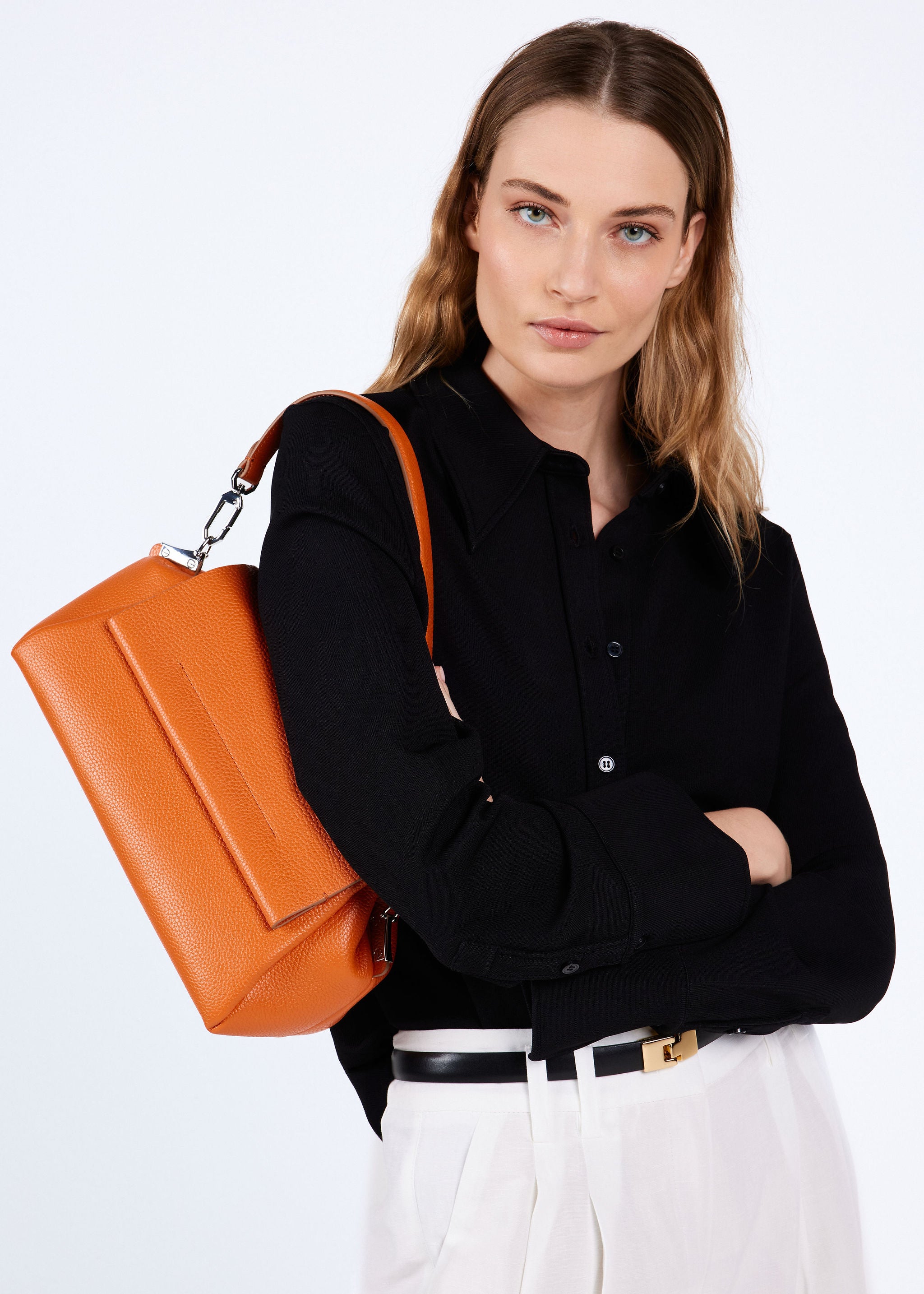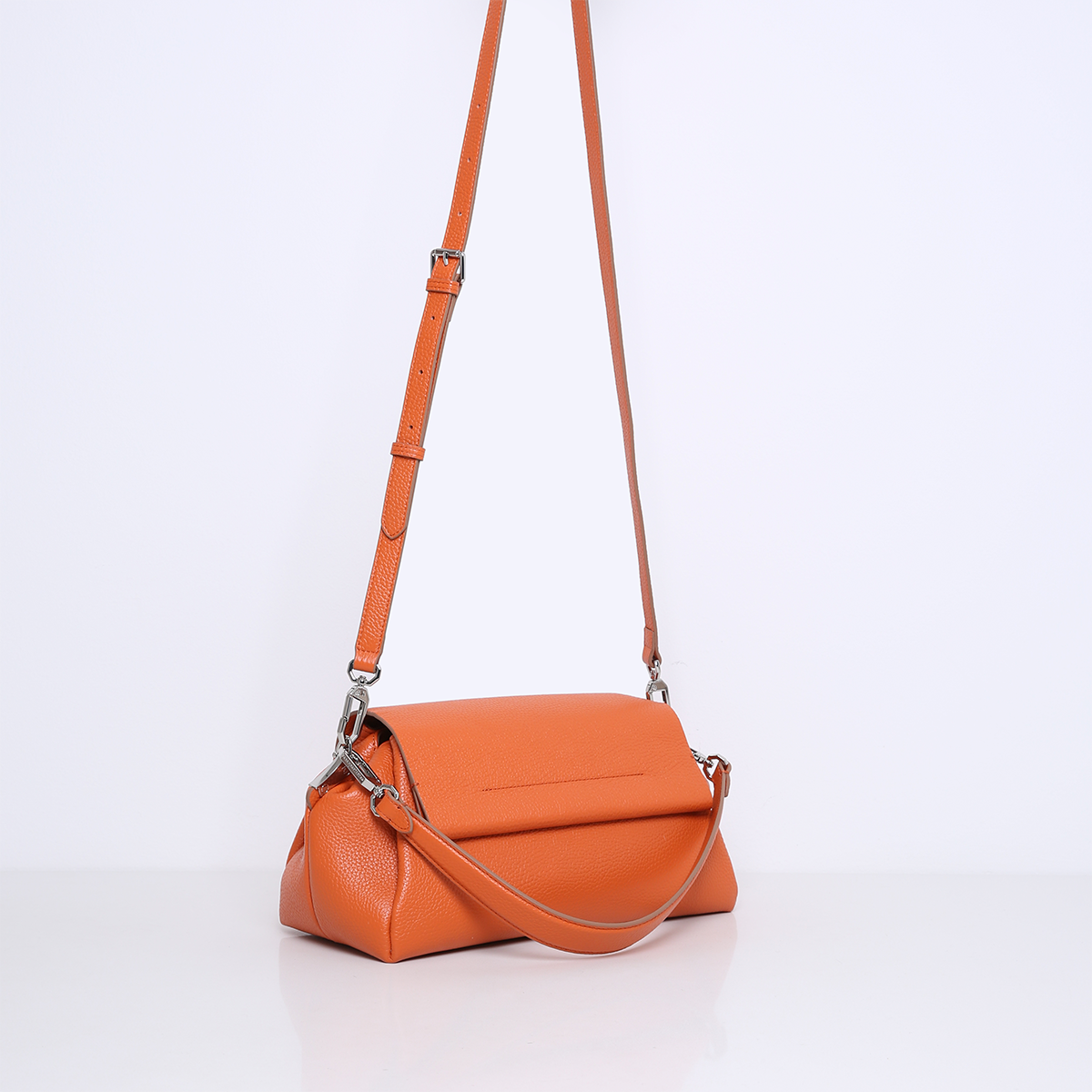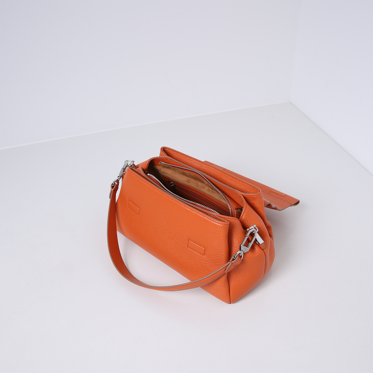 De tas komt met twee afneembare hengsels; een korte schouderband en een lange crossbody band die verstelbaar is in lengte. De tas is gemaakt van zacht en soepel rundleer gevoerd met suedine (viscose) materiaal.