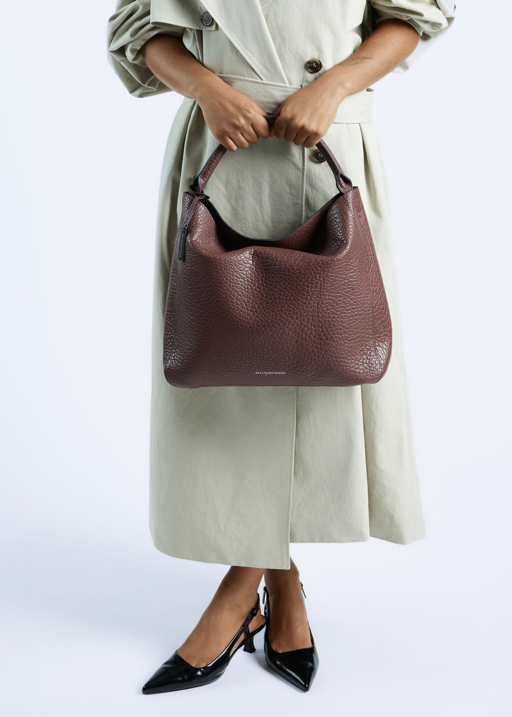 De tas is gemaakt van stevig rundleer met een reliëfpatroon van olifantenhuid. De tas is open aan de bovenkant en gesloten met een magneetsluiting welke mooi over elkaar valt. Beschikt over meerdere binnenvakjes en is gevoerd met suedine (viscose) materiaal.