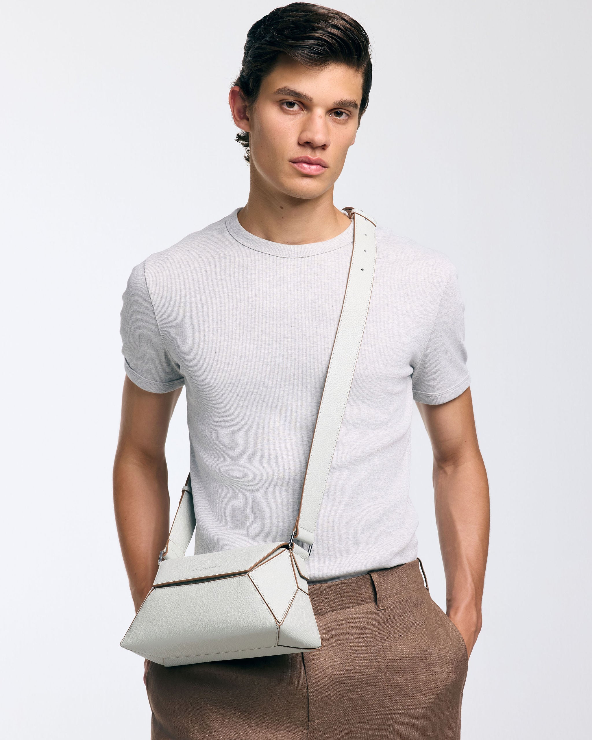 Het stevige, rechthoekige model is breed maar compact genoeg om elegant te dragen, of je hem nu over je schouder hangt of in de hand houdt. De tas heeft een interessante puzzelachtige uitstraling door de lijnen in het leer, wat het ontwerp een modern en verfijnd karakter geeft. De bovenkant opent met een onzichtbare magneetsluiting, wat zorgt voor een strakke en gestroomlijnde afwerking.