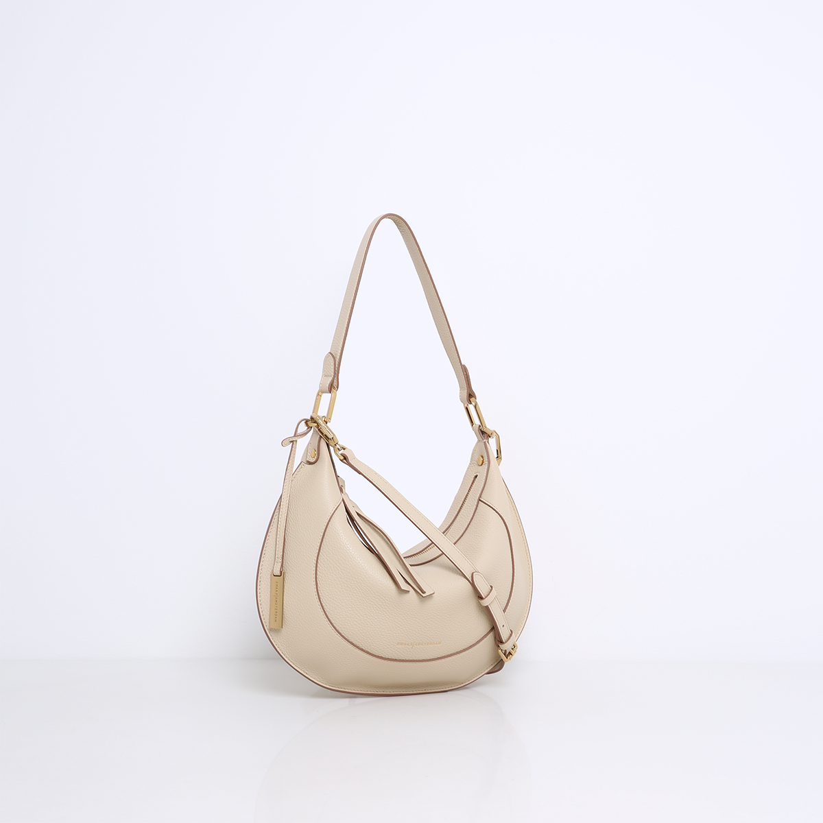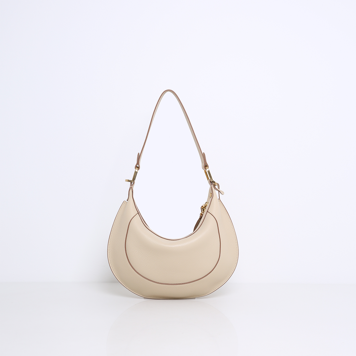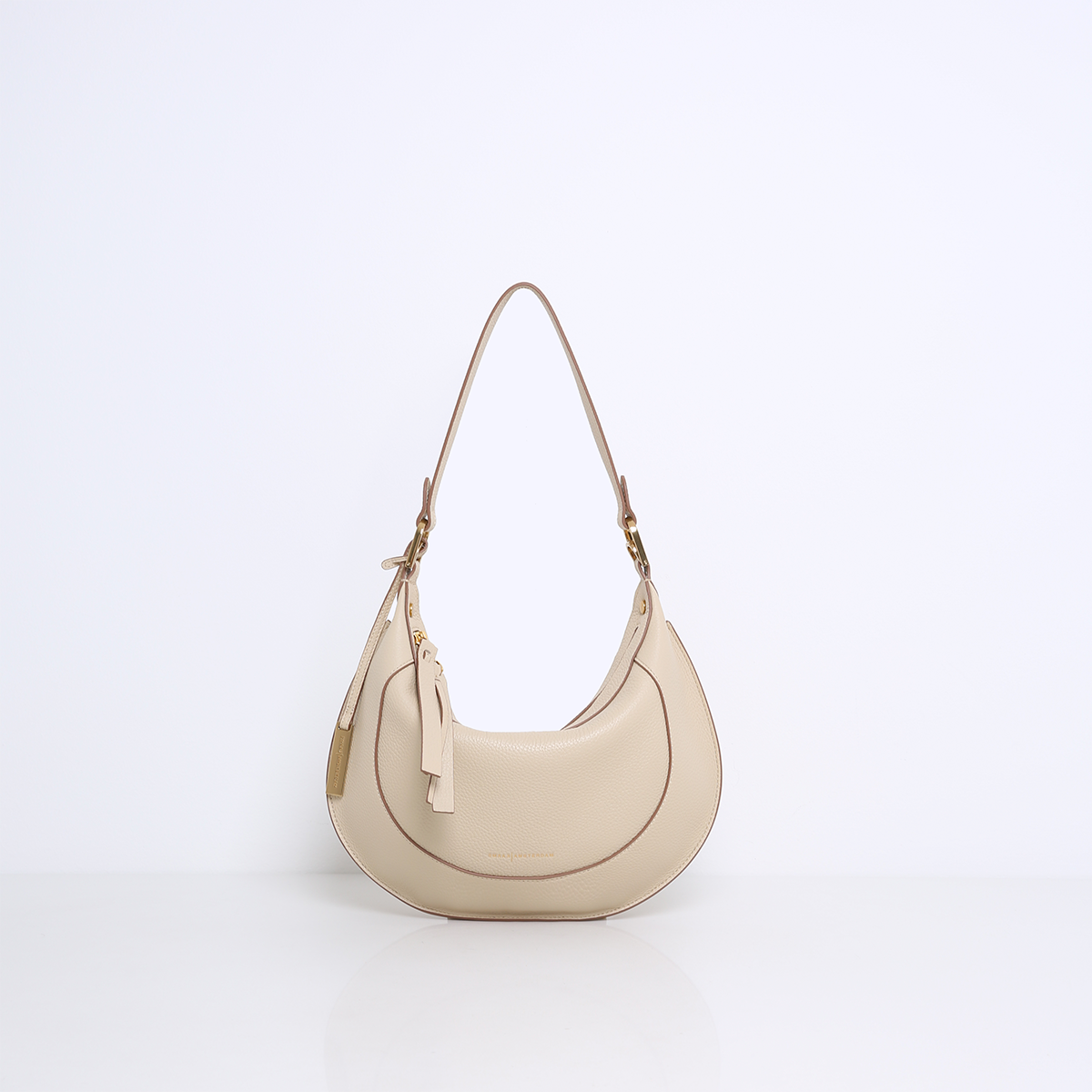 De MARLON is een elegante tas met een opvallende, ovale saddle bag-vorm die direct in het oog springt. De tas is prachtig afgewerkt met verfijnde stiksels en luxe goudkleurige hardware, wat zorgt voor een chique en moderne uitstraling.