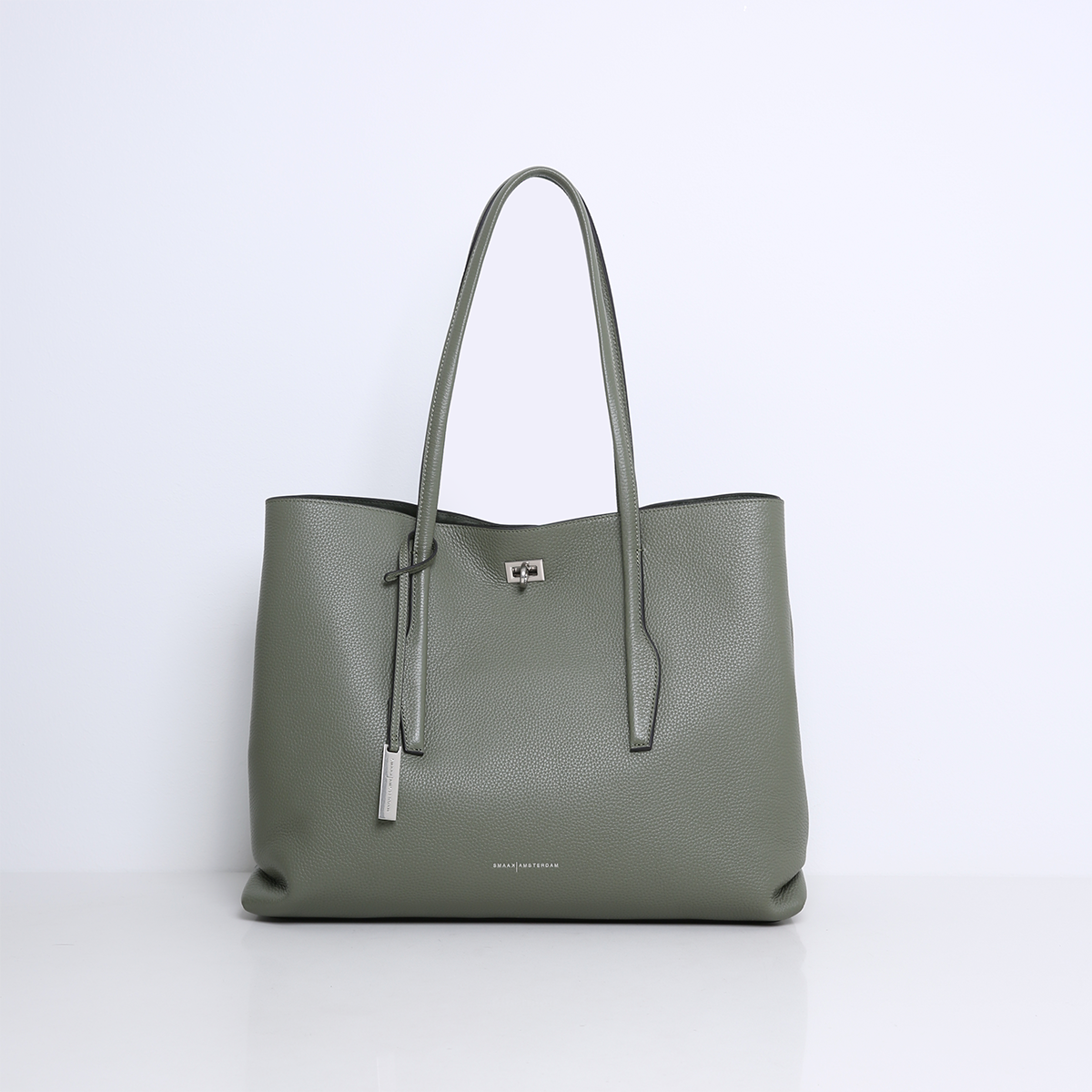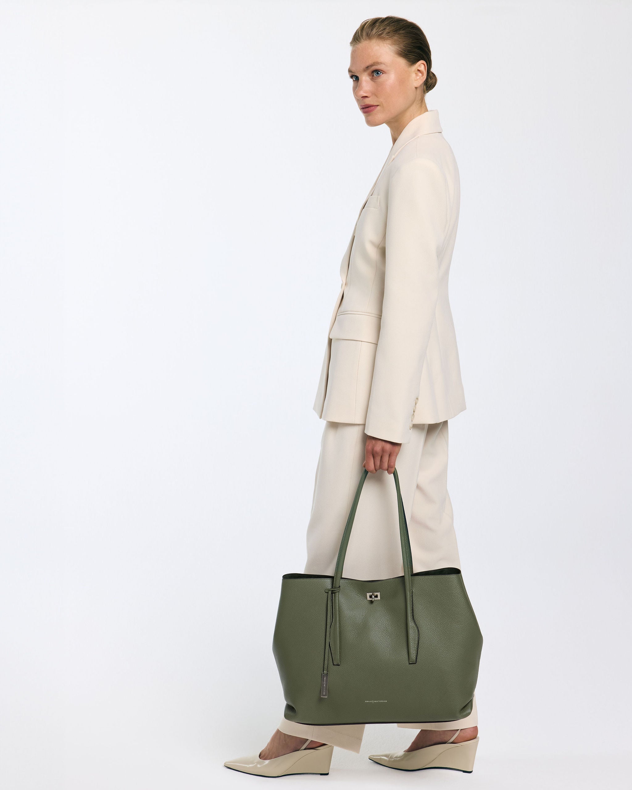 Op de voorzijde siert een subtiel zilverkleurig slotje het ontwerp, een verfijnd accent dat de strakke vorm benadrukt. Aan de zijkanten zitten verborgen drukknopen, waarmee je de tas eenvoudig ruimer maakt wanneer dat nodig is. De zachte vouwen aan de zijkanten geven het silhouet een ontspannen, maar doordachte vorm.
