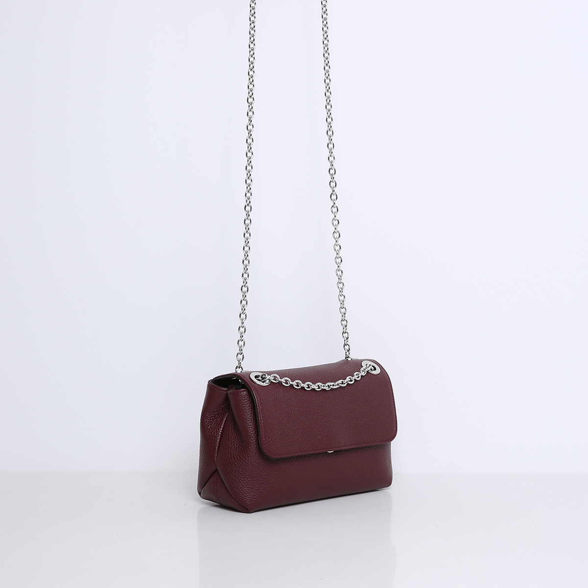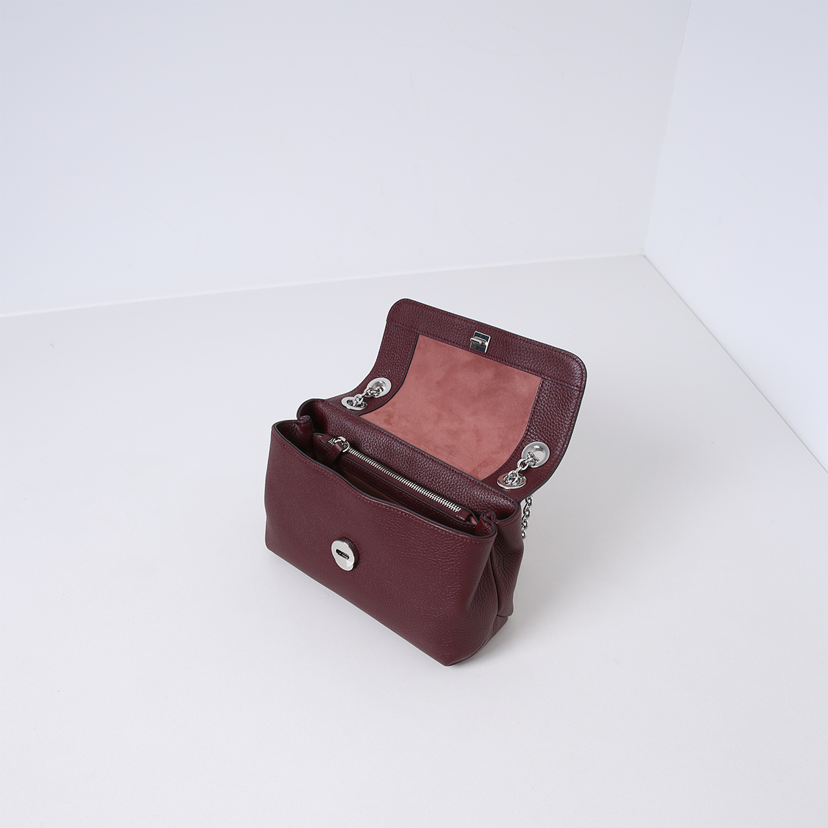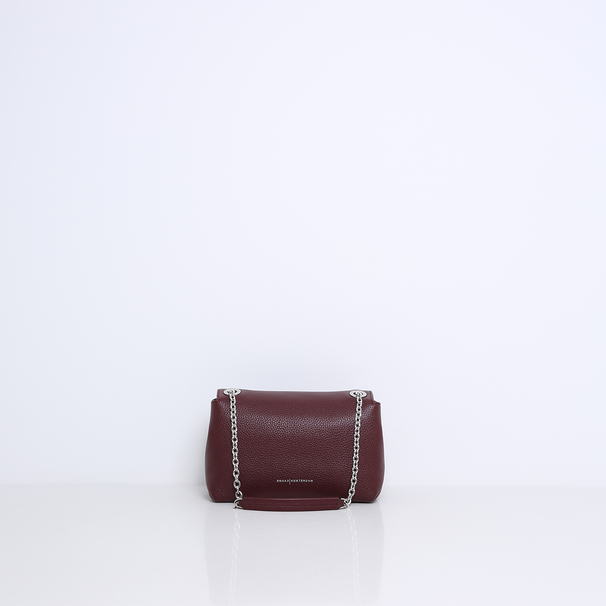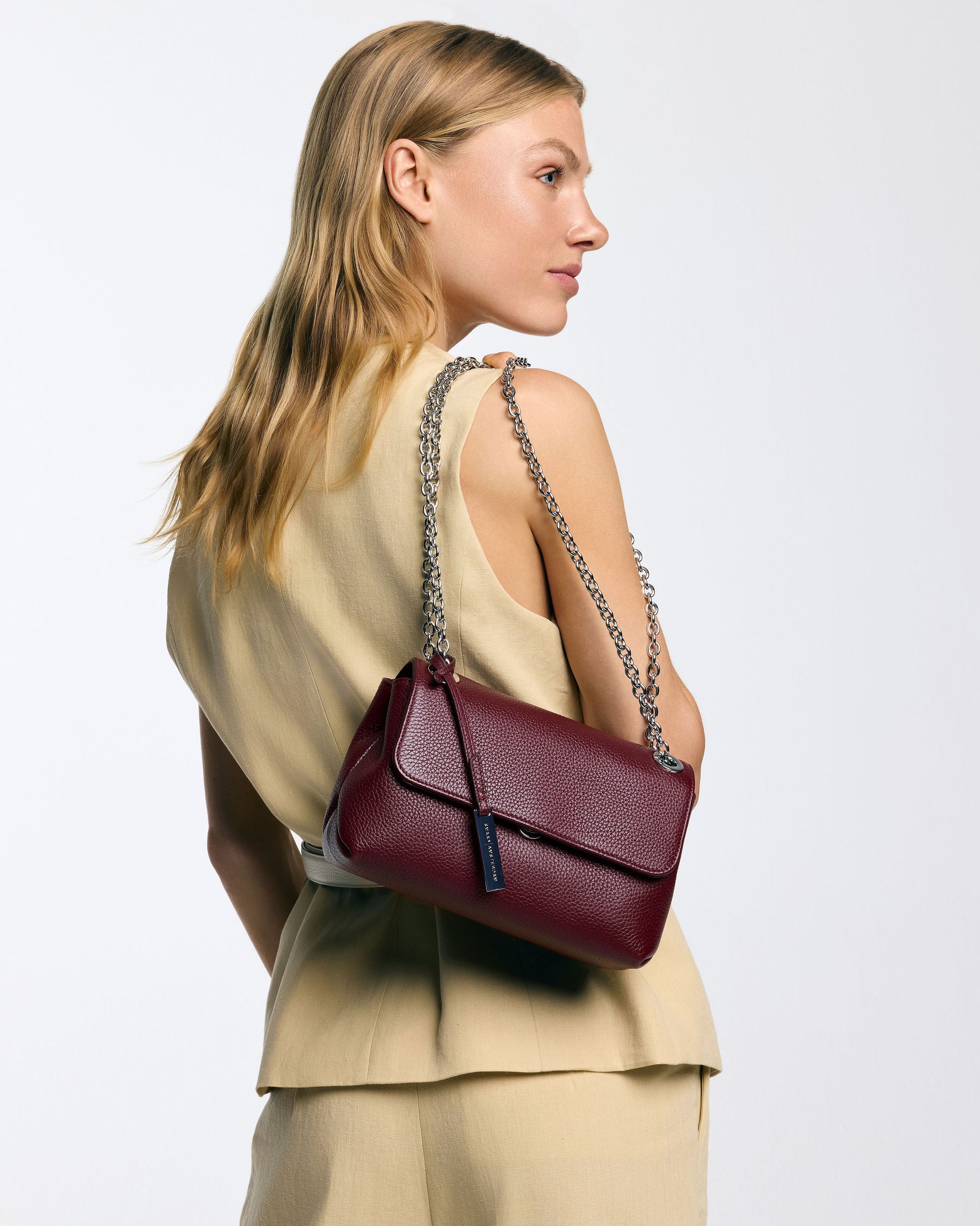 De tas heeft aan de binnenkant twee compartimenten, gescheiden door een middenvak met ritssluiting. Daarnaast beschikt ze over meerdere binnenvakjes en is ze gevoerd met suedine (viscose) materiaal. De tas opent aan de voorkant en sluit met een kliksluiting. Op het middenstuk van de zilveren hardware ketting is de tas afgewerkt met leer, zodat ze soepel en comfortabel op de schouder gedragen kan worden. De tas is gemaakt van zacht en soepel leer.