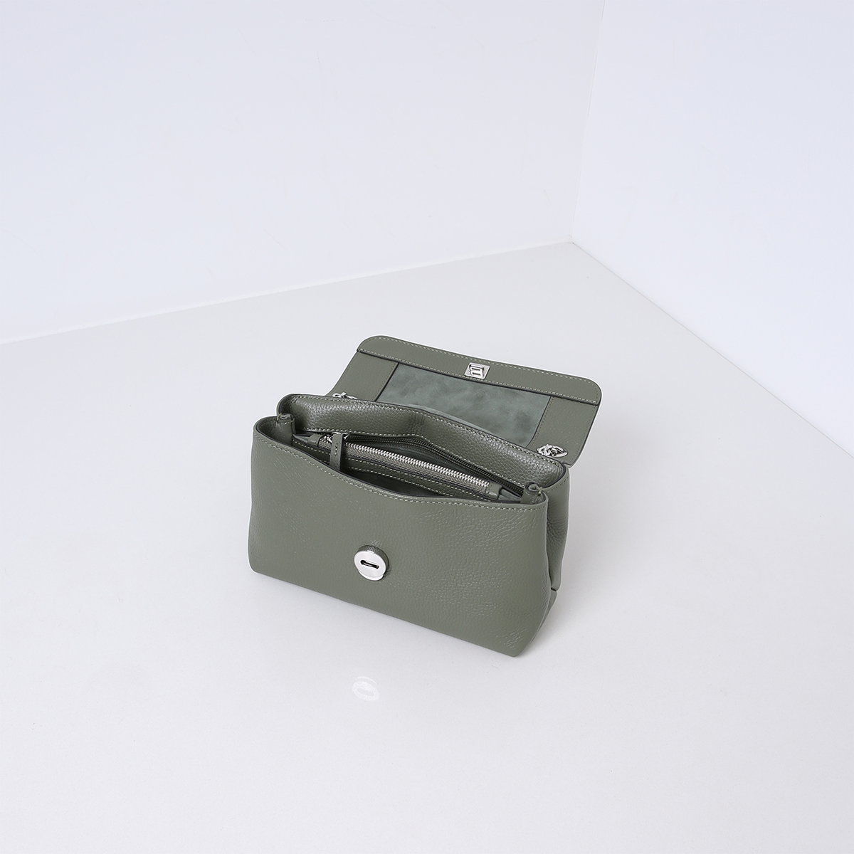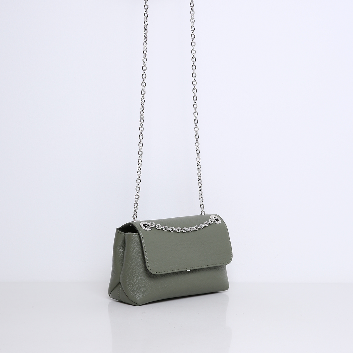 De tas heeft aan de binnenkant twee compartimenten, gescheiden door een middenvak met ritssluiting. Daarnaast beschikt ze over meerdere binnenvakjes en is ze gevoerd met suedine (viscose) materiaal. De tas opent aan de voorkant en sluit met een kliksluiting. Op het middenstuk van de zilveren hardware ketting is de tas afgewerkt met leer, zodat ze soepel en comfortabel op de schouder gedragen kan worden. De tas is gemaakt van zacht en soepel leer.