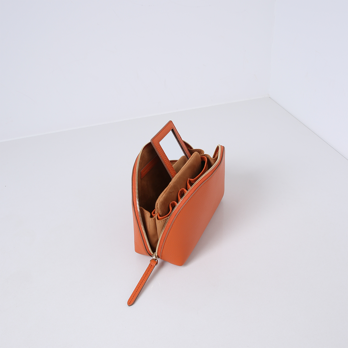 Ontdek onze luxe leren cosmetic case, ontworpen voor veelzijdigheid en stijl. Deze prachtige make-up tas kan ook dienen als clutch, extra binnentas, of toilettas. De binnenkant biedt extra functionaliteit met gescheiden binnenvakjes, perfect voor het opbergen van een mini spiegel en losse vakjes speciaal voor lippenstift, mascara en andere (make-up) eigendommen. Het interieur is gevoerd met zacht suedine (viscose) materiaal voor een luxe touch en extra bescherming van je items. De tas heeft een elegante ronde/halve maan vorm en is voorzien van een ritssluiting aan de bovenkant die aan beide kanten geopend kan worden, voor gemakkelijke toegang en een chique uitstraling. Deze cosmetic case combineert functionaliteit met verfijnde stijl, ideaal voor zowel dagelijks gebruik als reizen.