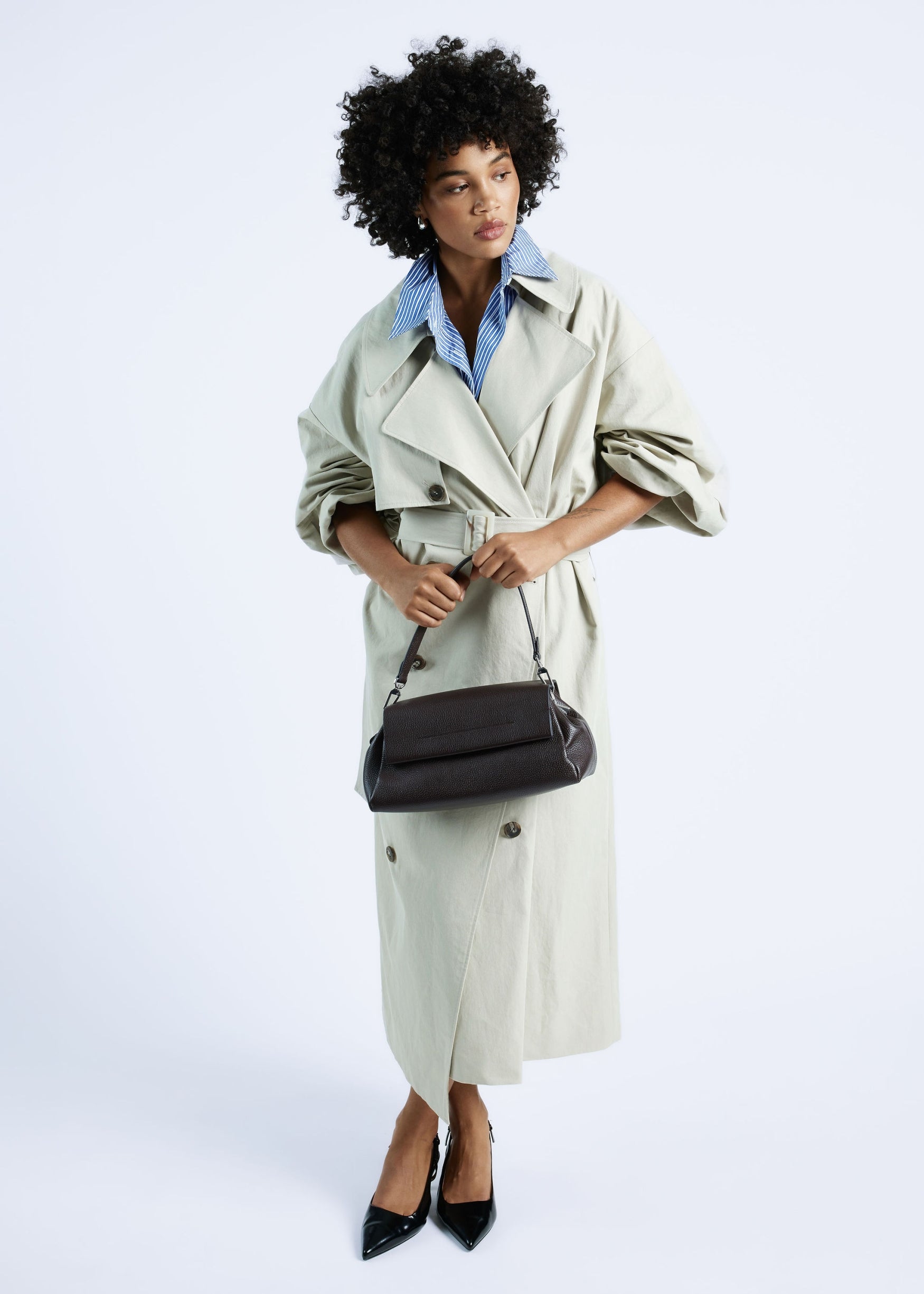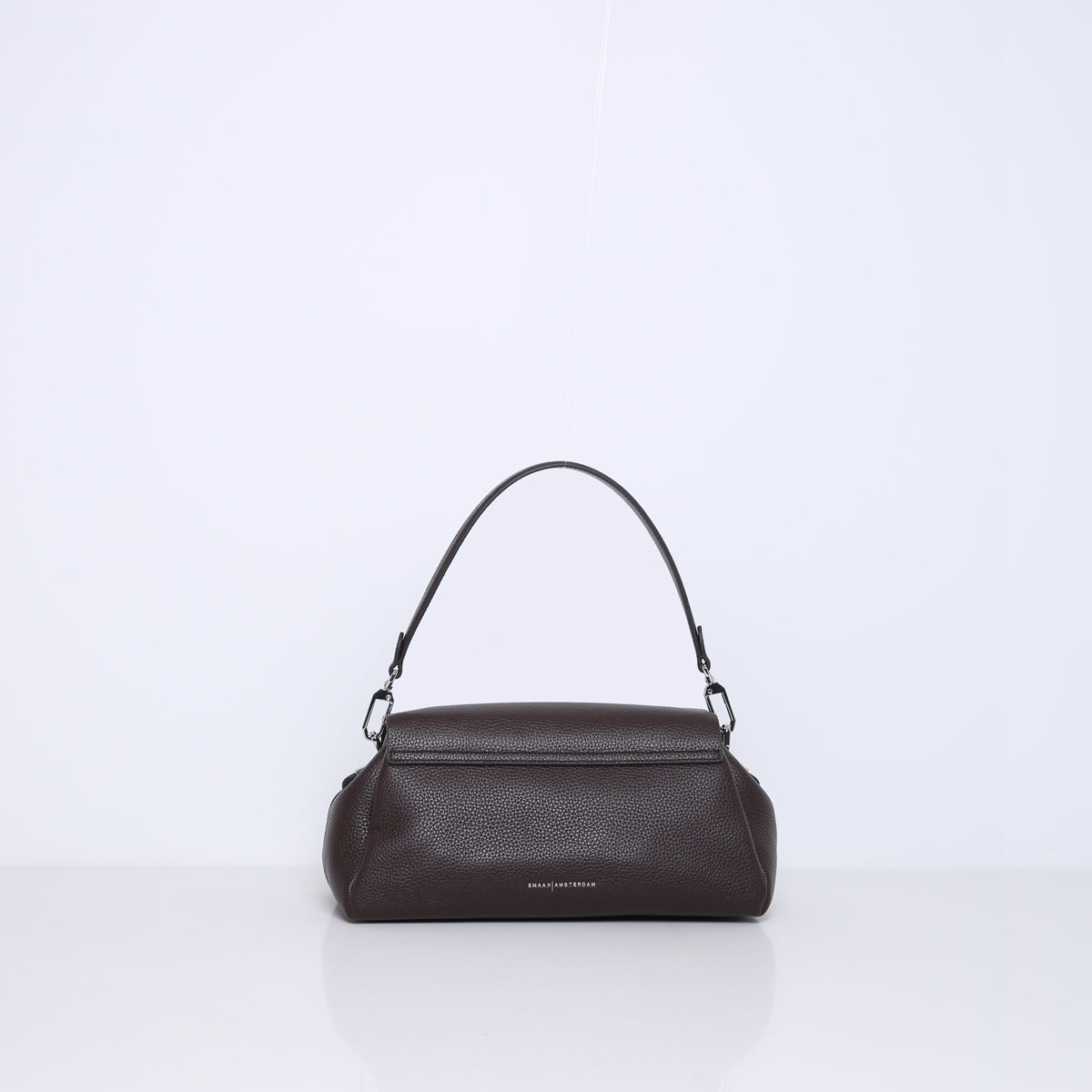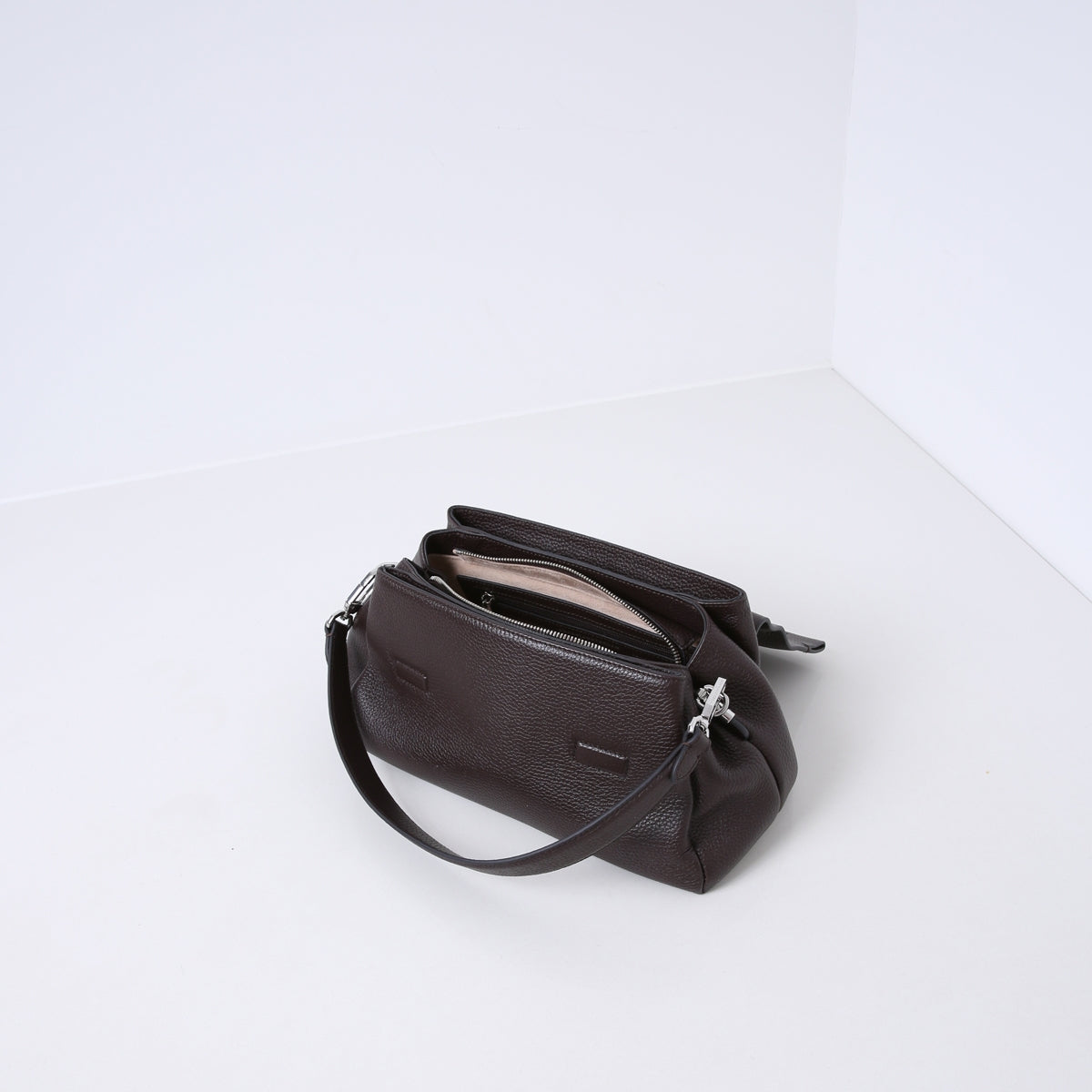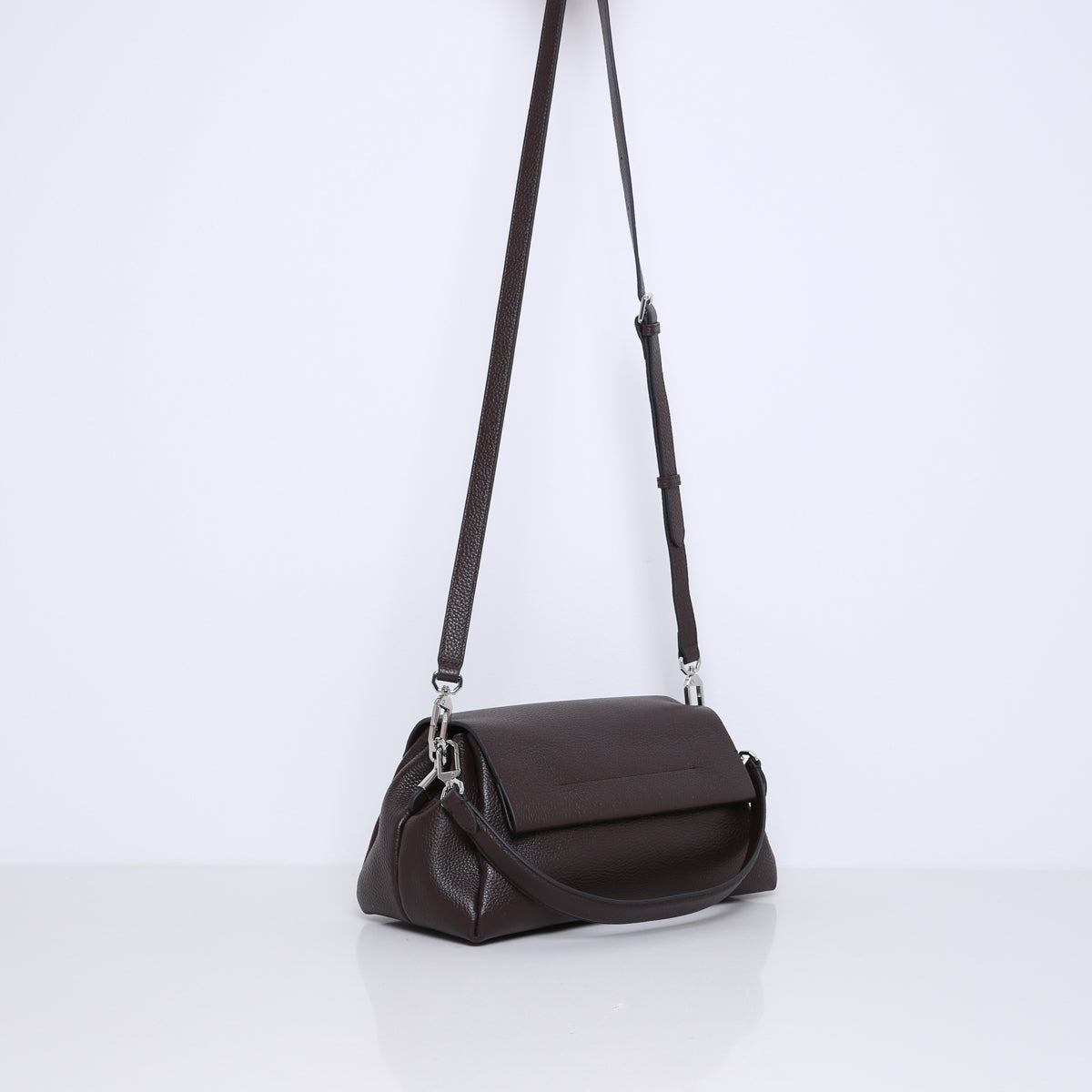 The bag comes with two detachable handles: a short shoulder strap and a long, adjustable crossbody strap. The bag is made of soft, supple cowhide leather lined with suede (viscose).