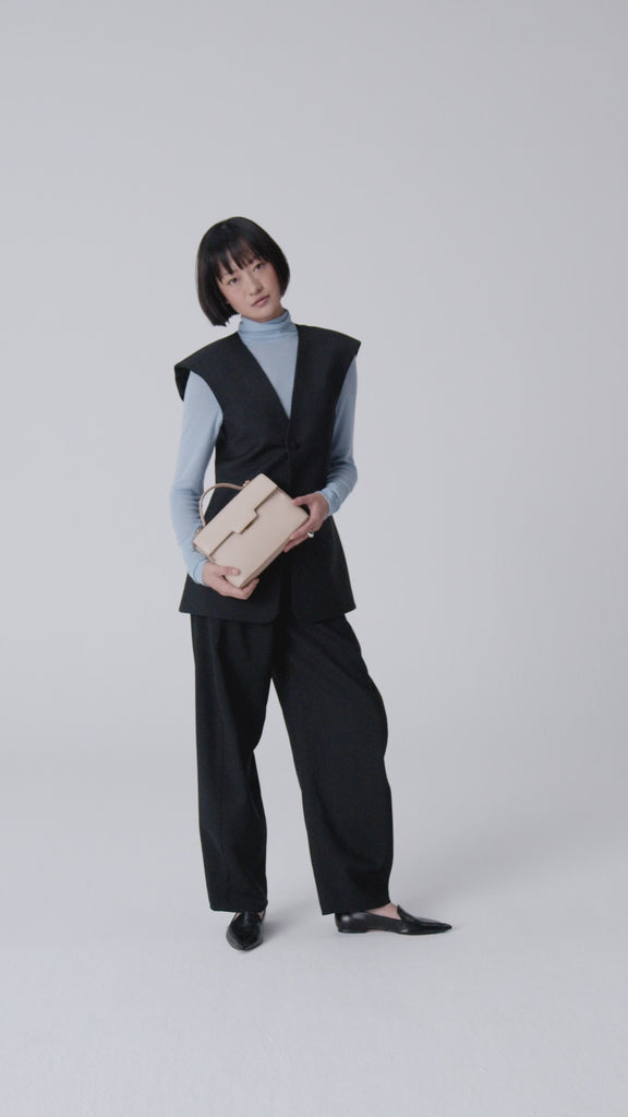 The FLORA has a short handle and a detachable leather crossbody strap that attaches to the top. The handbag opens at the front with a snap closure. There's plenty of room for all your essentials, such as a phone, wallet, (sun)glasses, and keys. Its rectangular, open shape allows for easy and organized access to your belongings.