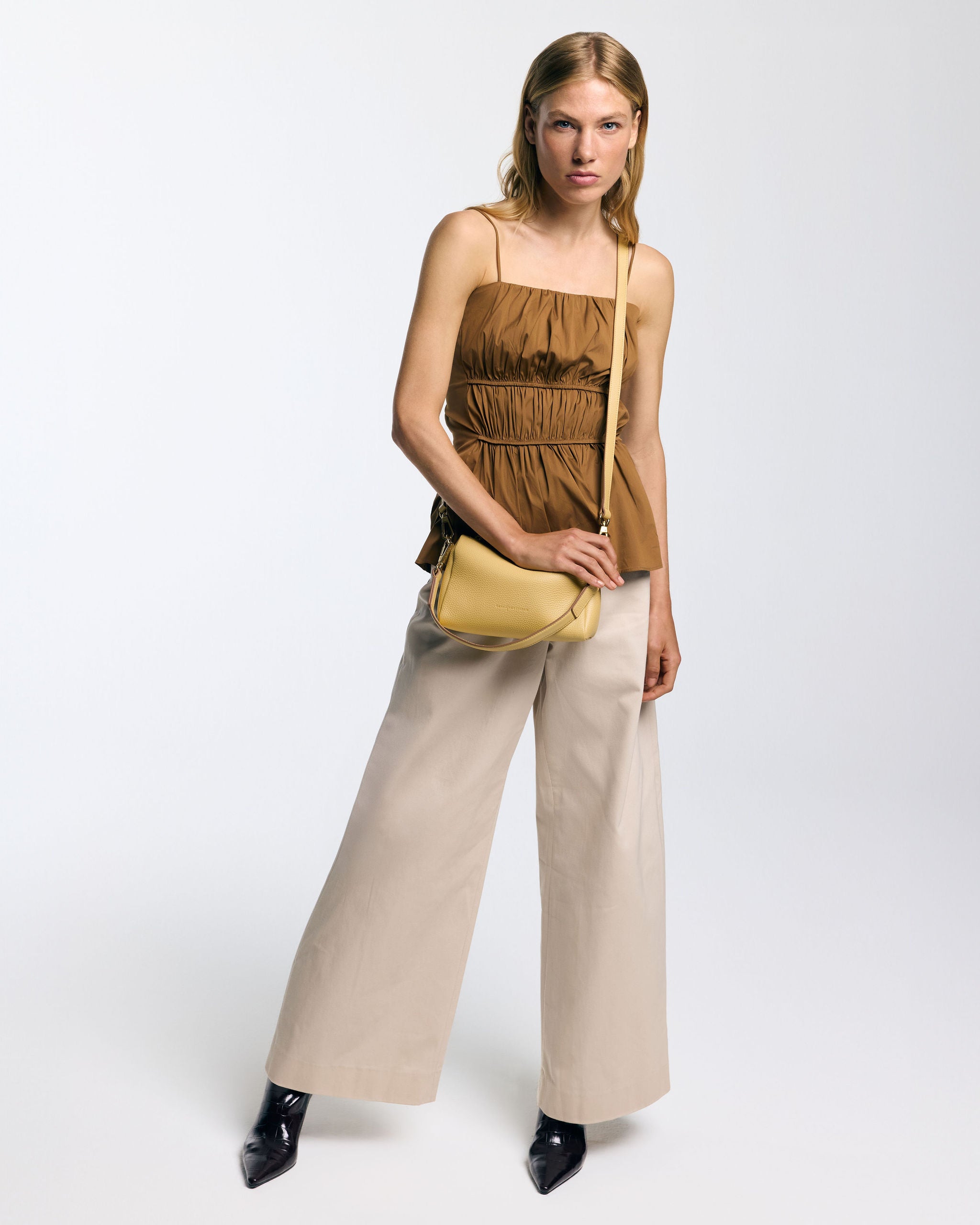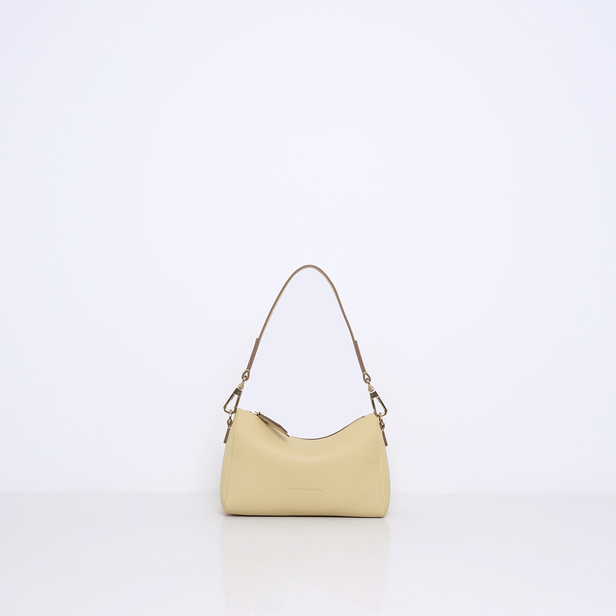 The JACK comes with a short shoulder strap, allowing the bag to rest just below the armpit. The detachable leather shoulder strap allows you to also wear it crossbody. It features two interior pockets and is lined with suede (viscose). The bag is made of soft, supple cowhide.