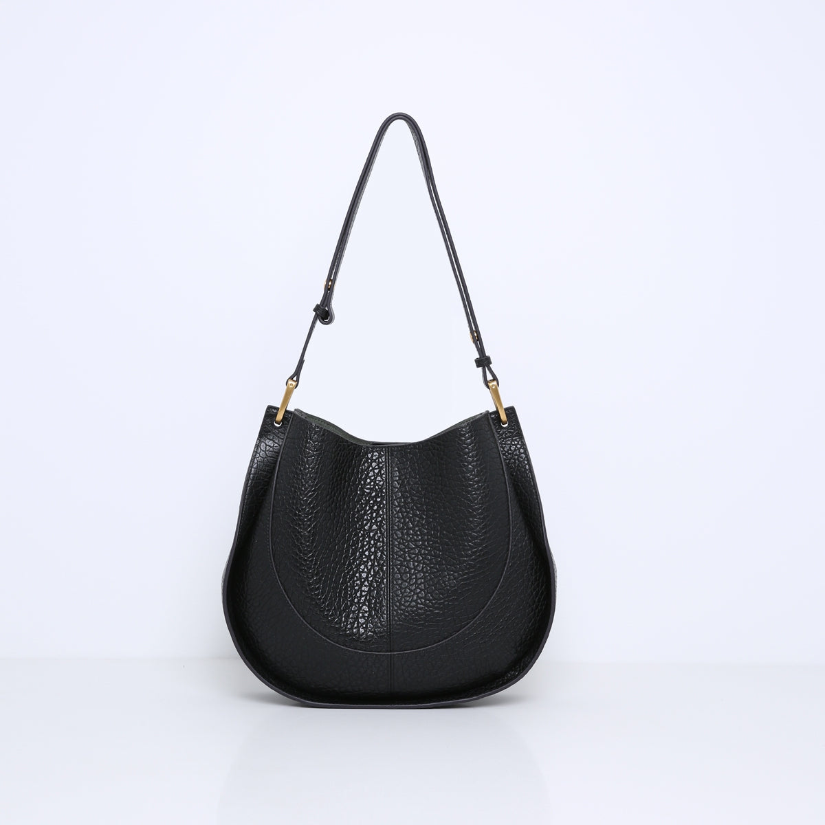 The bag is made of sturdy cowhide leather with an elephant hide embossed pattern. It opens at the top and closes with a magnetic closure. It comes with a detachable zippered pouch finished in suede (viscose).