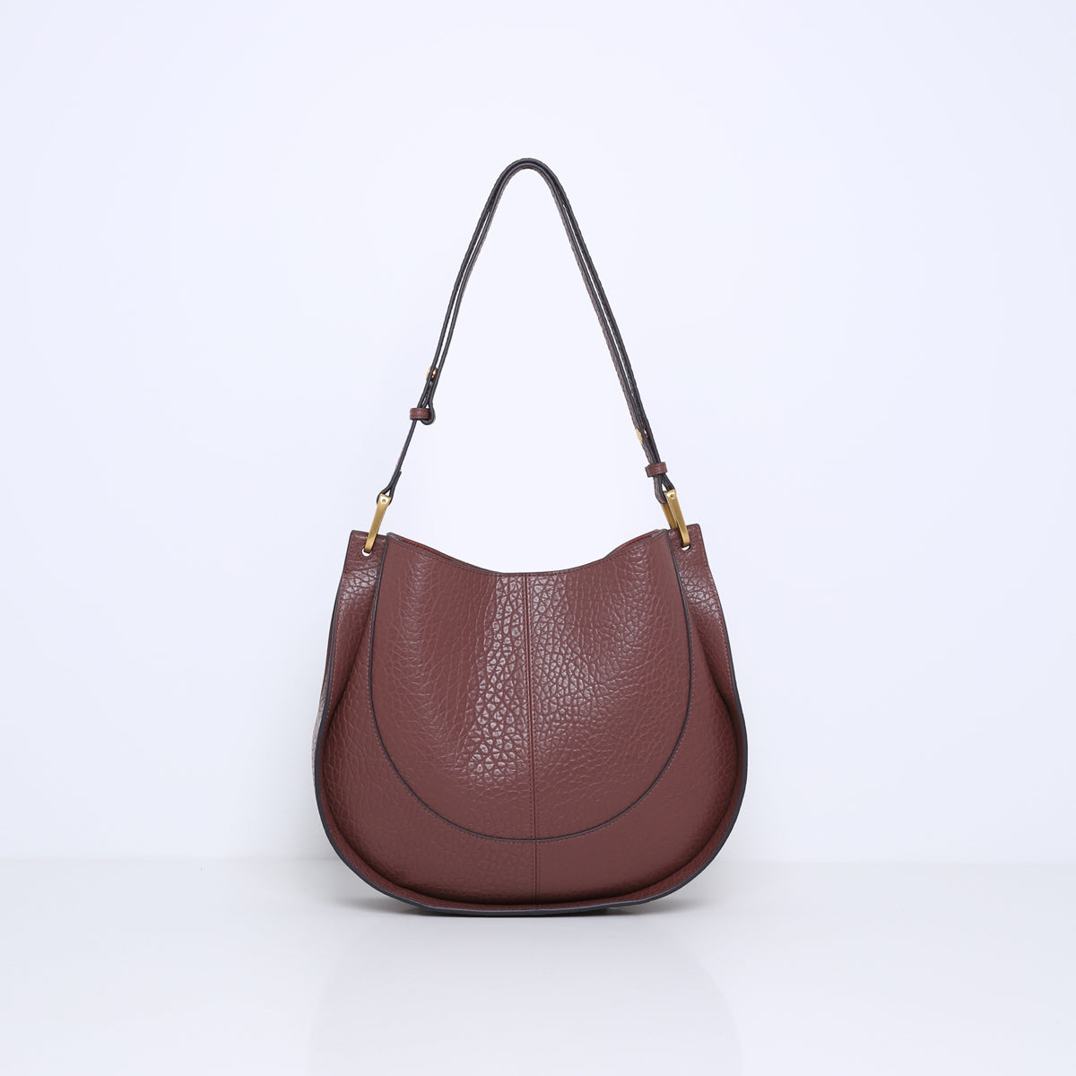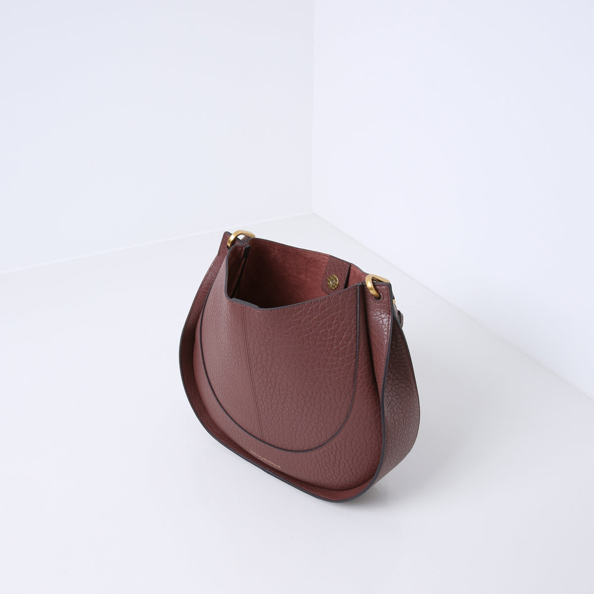 The bag is made of sturdy cowhide leather with an elephant hide embossed pattern. It opens at the top and closes with a magnetic closure. It comes with a detachable zippered pouch finished in suede (viscose).