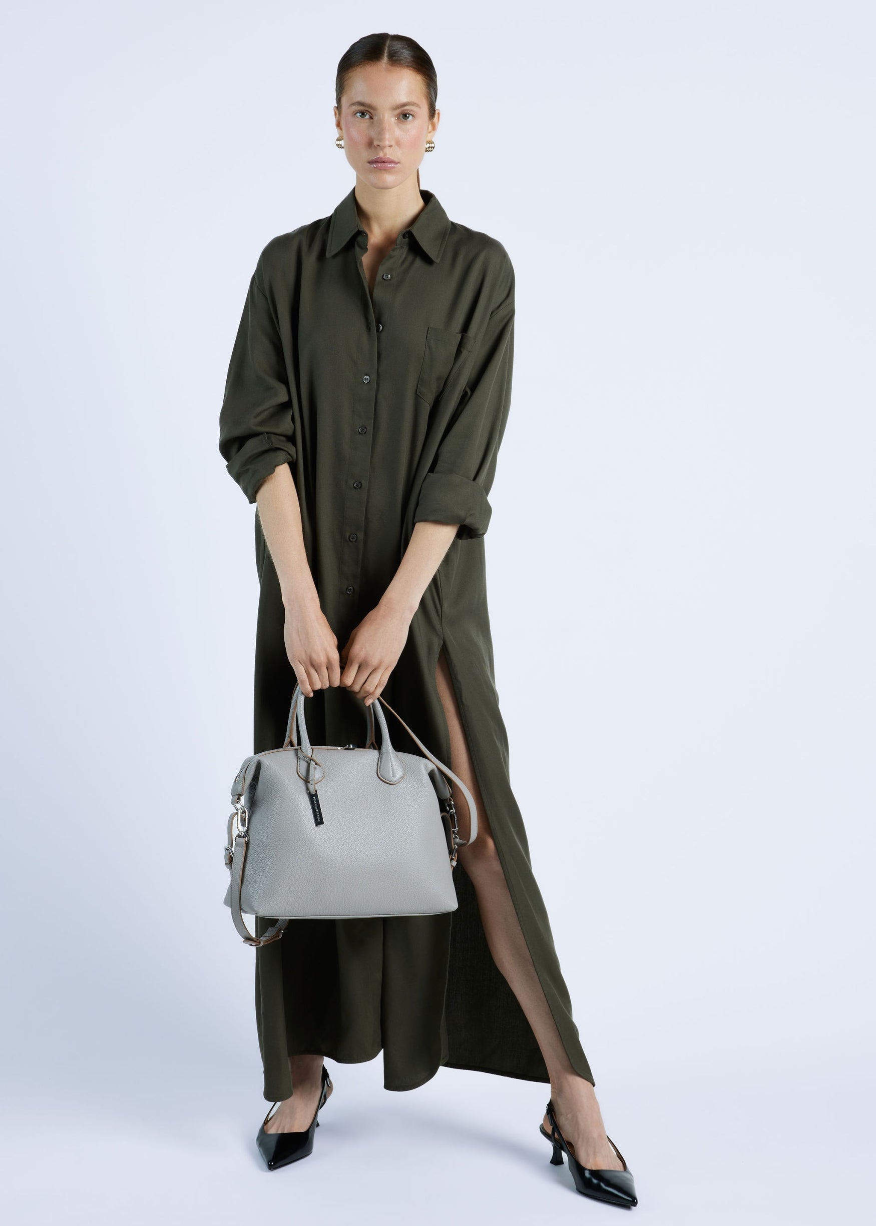 The bag is made of soft, supple cowhide. It features multiple interior pockets and is lined with suede (viscose). The detachable, adjustable leather shoulder strap allows you to wear it crossbody as well.