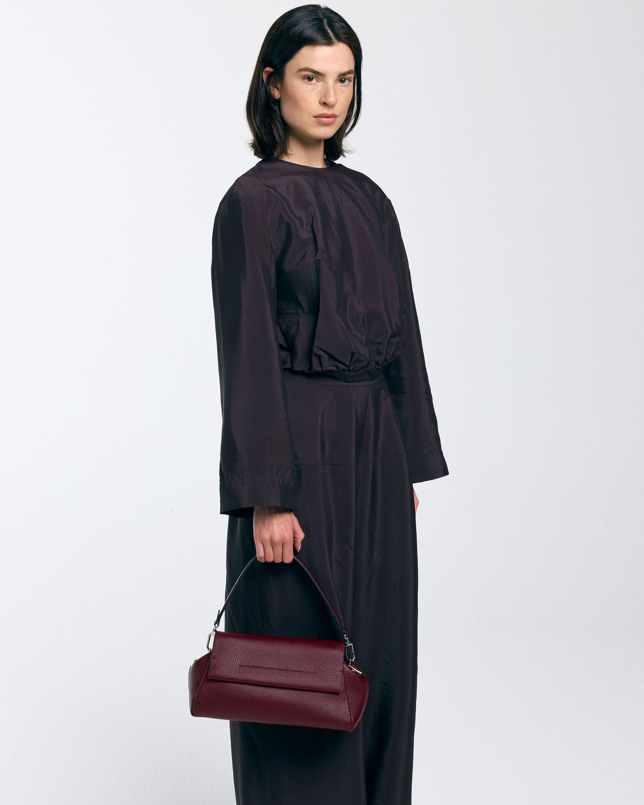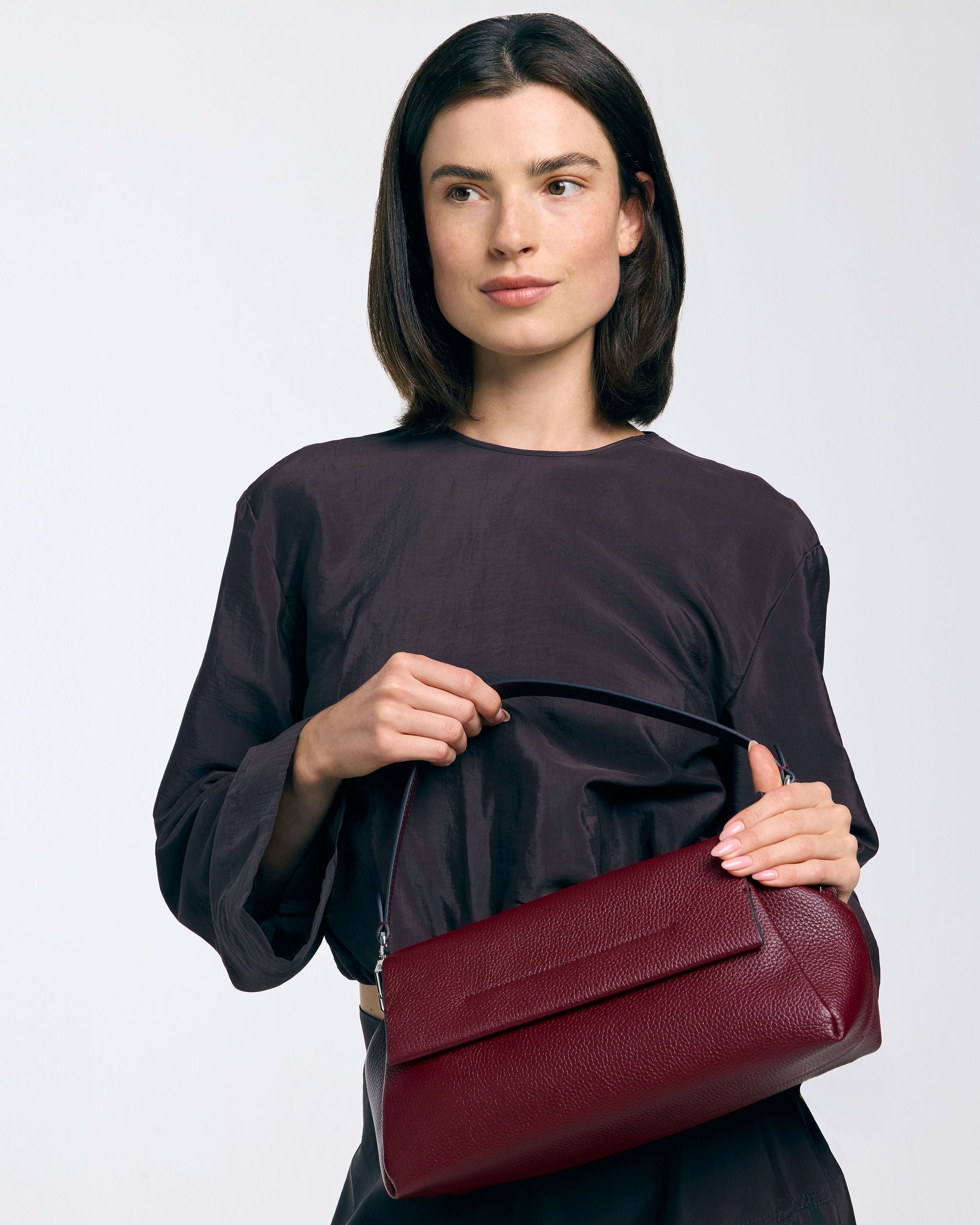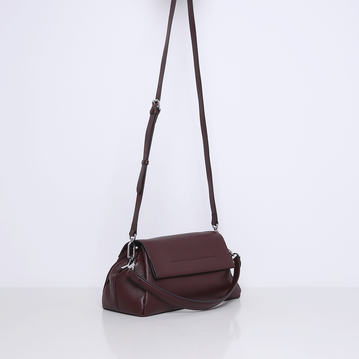 De tas komt met twee afneembare hengsels; een korte schouderband en een lange crossbody band die verstelbaar is in lengte. De tas is gemaakt van zacht en soepel rundleer gevoerd met suedine (viscose) materiaal.