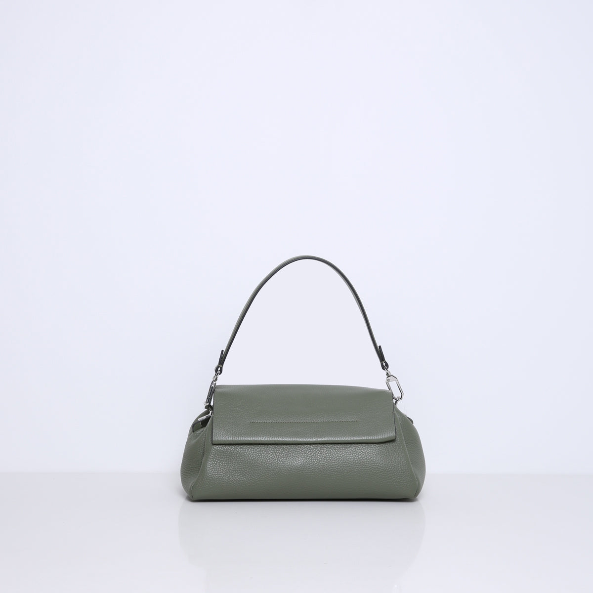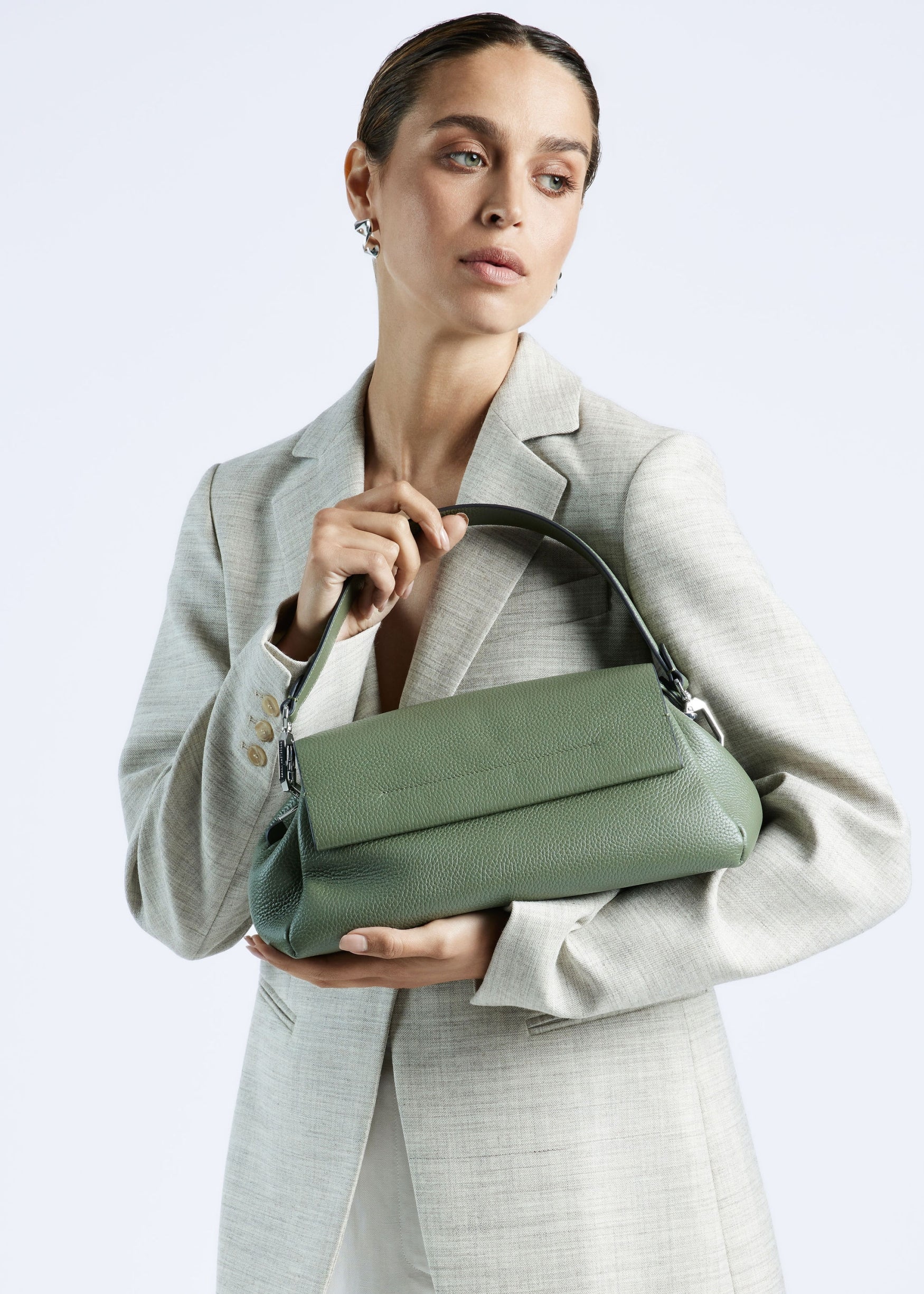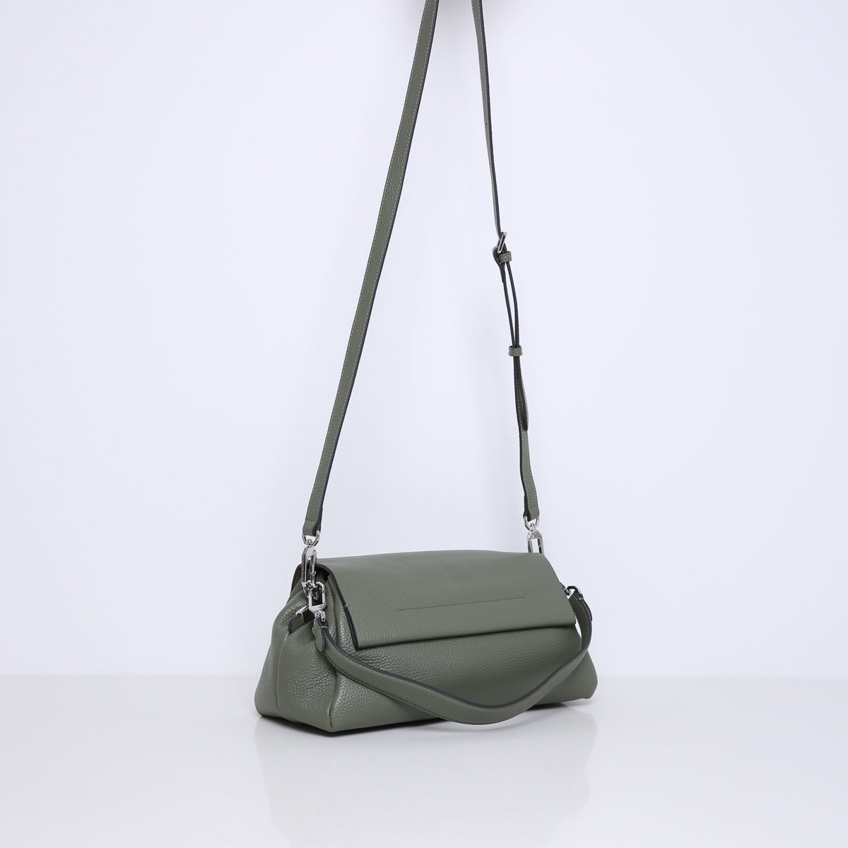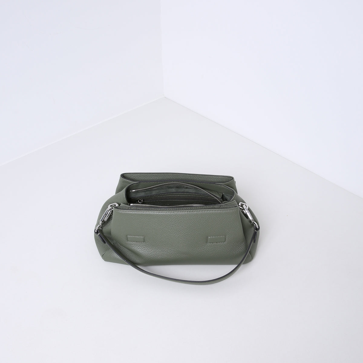 De tas komt met twee afneembare hengsels; een korte schouderband en een lange crossbody band die verstelbaar is in lengte. De tas is gemaakt van zacht en soepel rundleer gevoerd met suedine (viscose) materiaal.