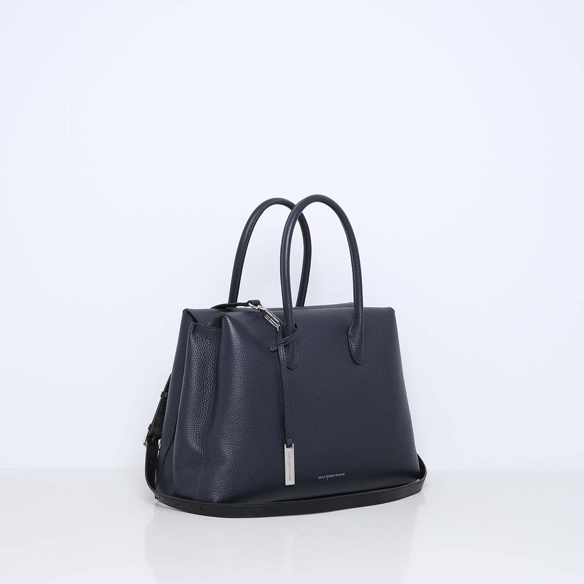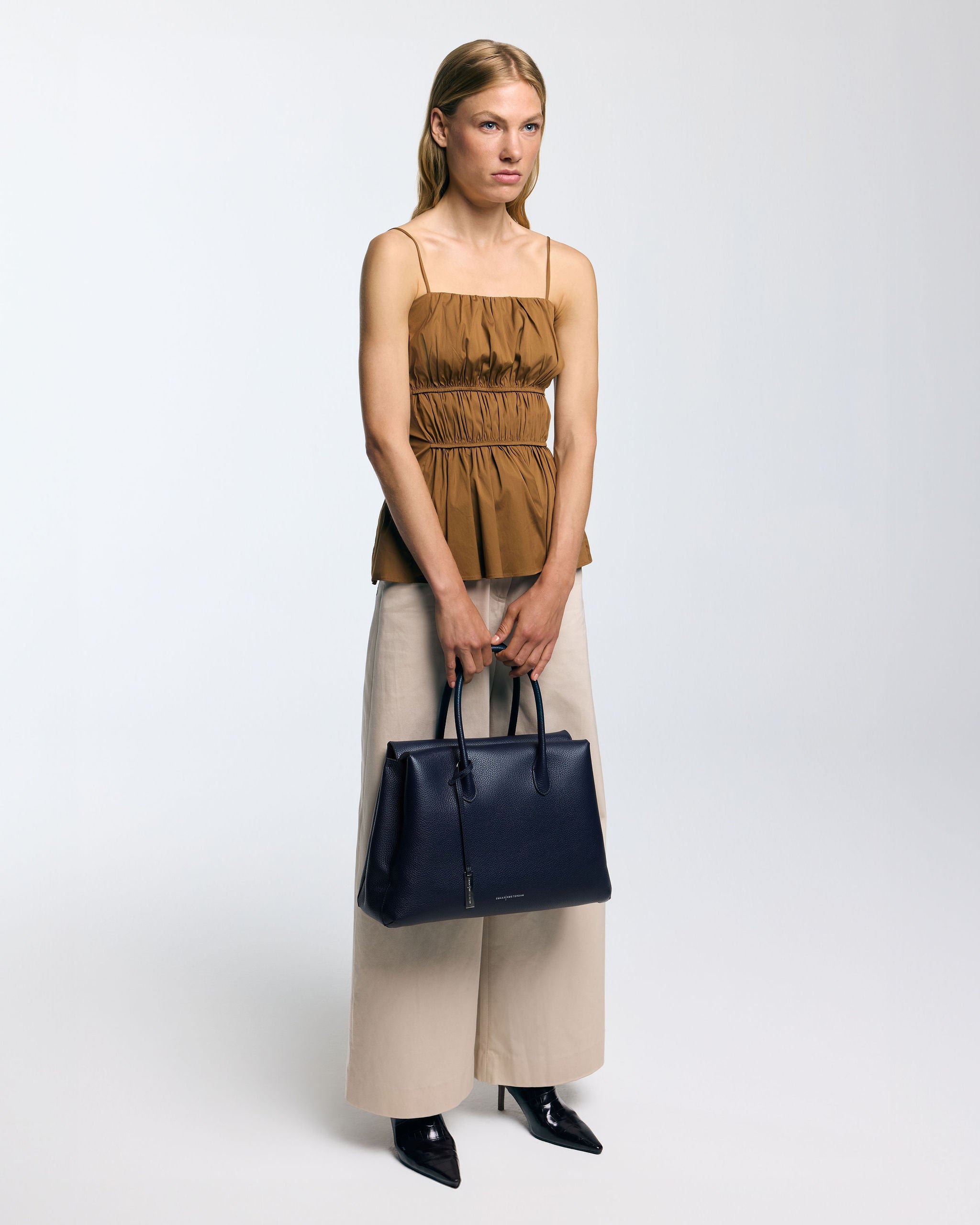 Hoewel de BETTE geen rits heeft, zorgen de overlappende leren flappen aan de bovenkant voor een subtiele, gesloten uitstraling. Hierdoor behoudt de tas een strakke en verfijnde vorm, terwijl je toch snel toegang hebt tot je spullen. De lange, afneembare strap maakt het mogelijk om de tas zowel als handtas als crossbodytas te dragen.