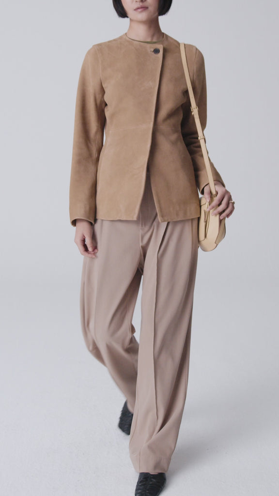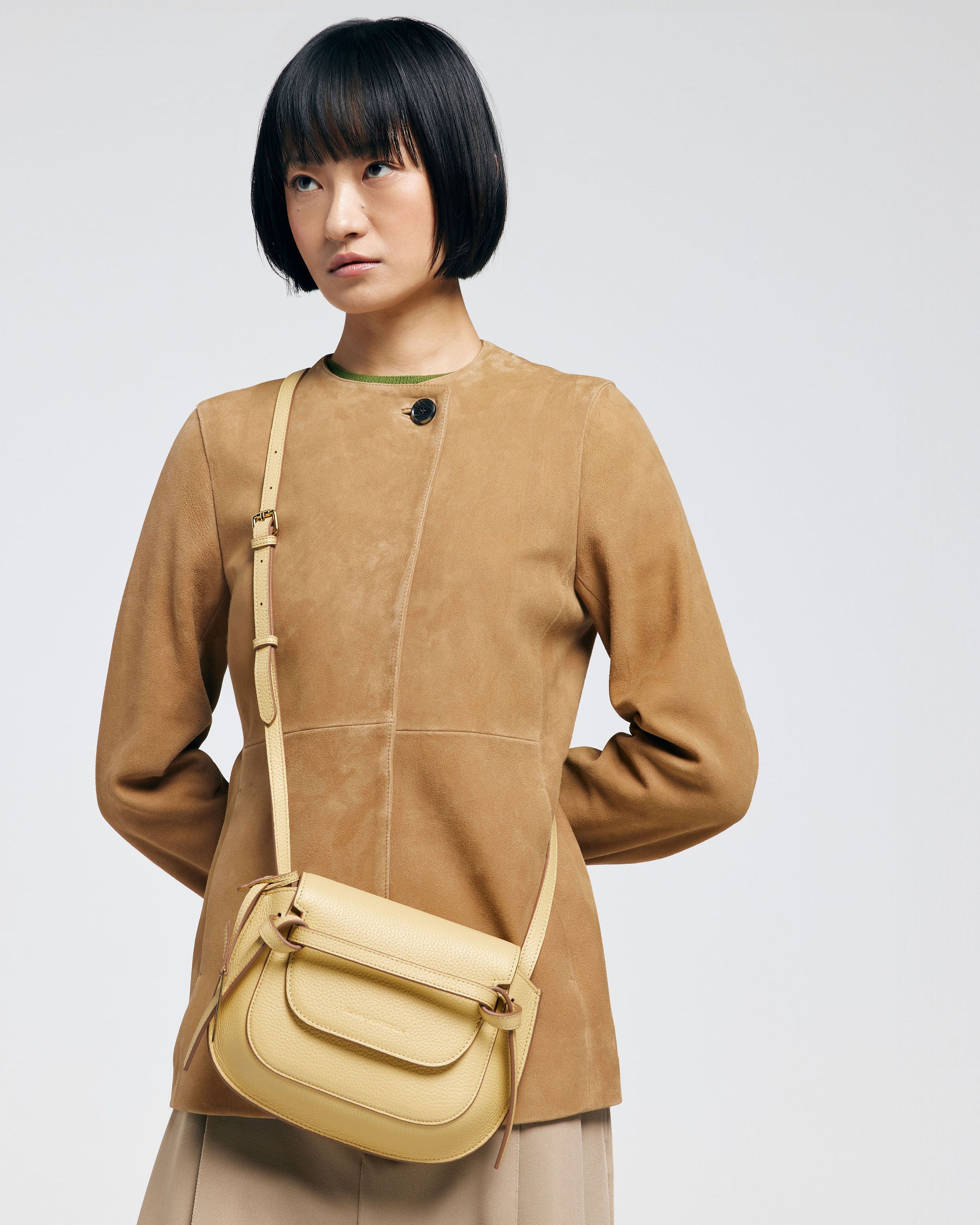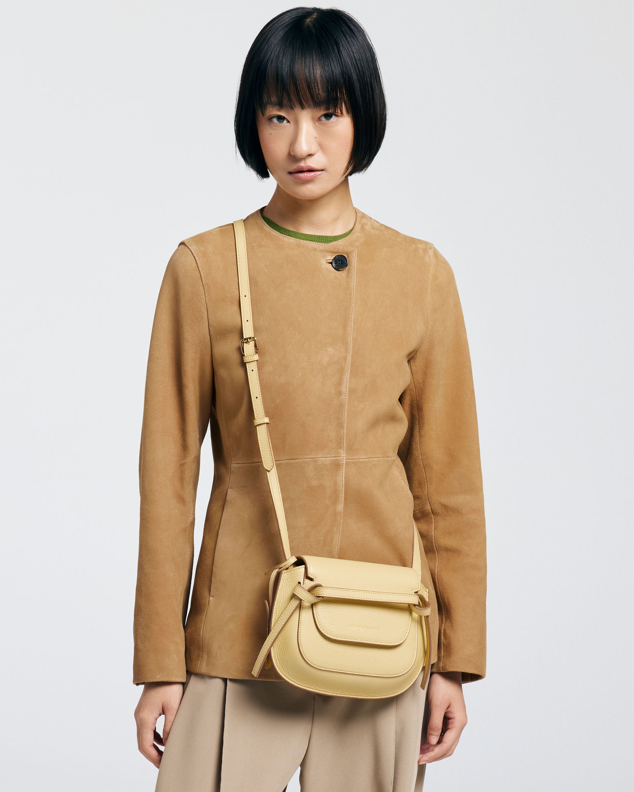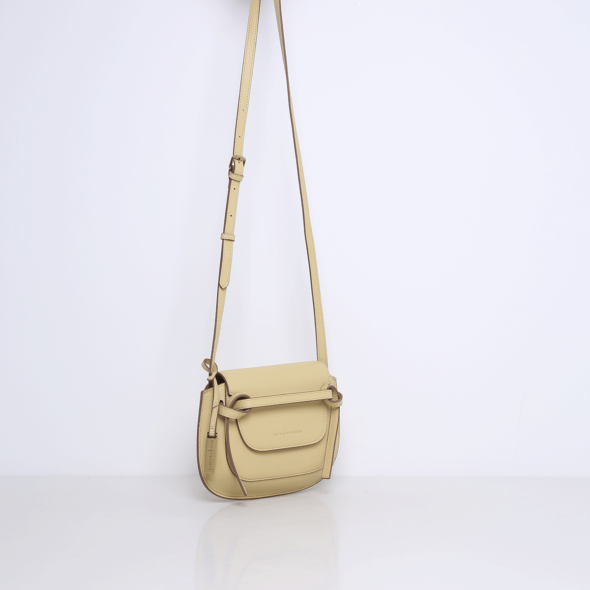 De tas is gemaakt van zacht en soepel rundleer. Beschikt over meerdere binnenvakjes en is gevoerd met stof (viscose). De leren schouderband is verstelbaar in lengte en zit vast aan de tas.