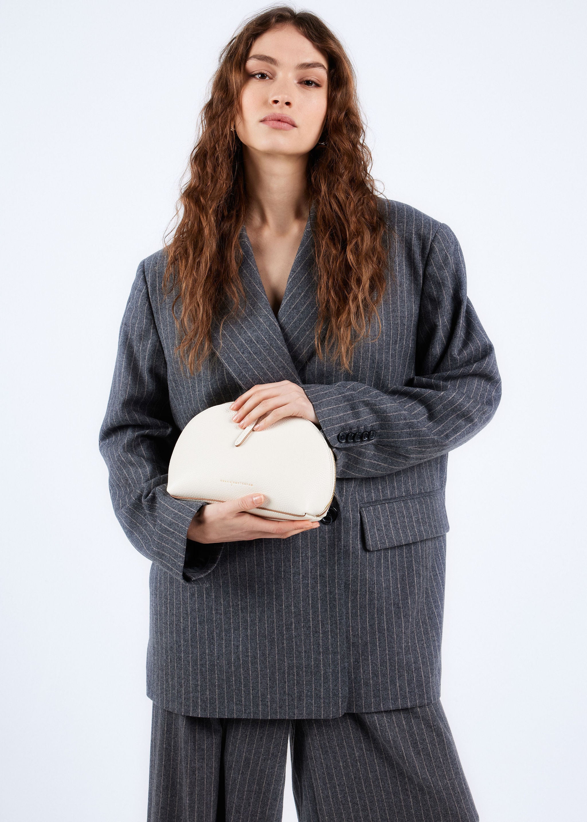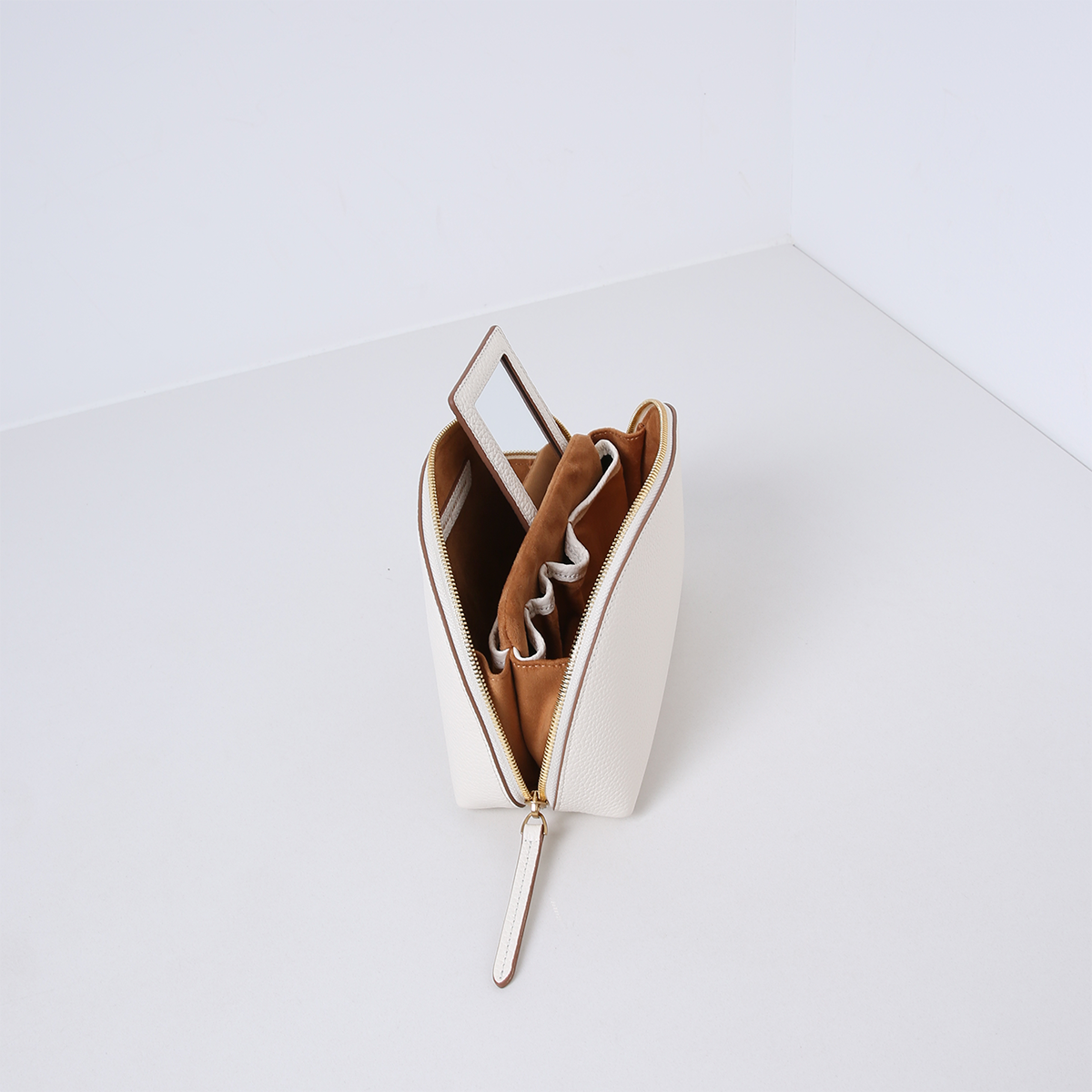 Ontdek onze luxe leren cosmetic case, ontworpen voor veelzijdigheid en stijl. Deze prachtige make-up tas kan ook dienen als clutch, extra binnentas, of toilettas. De binnenkant biedt extra functionaliteit met gescheiden binnenvakjes, perfect voor het opbergen van een mini spiegel en losse vakjes speciaal voor lippenstift, mascara en andere (make-up) eigendommen. Het interieur is gevoerd met zacht suedine (viscose) materiaal voor een luxe touch en extra bescherming van je items. De tas heeft een elegante ronde/halve maan vorm en is voorzien van een ritssluiting aan de bovenkant die aan beide kanten geopend kan worden, voor gemakkelijke toegang en een chique uitstraling. Deze cosmetic case combineert functionaliteit met verfijnde stijl, ideaal voor zowel dagelijks gebruik als reizen.
