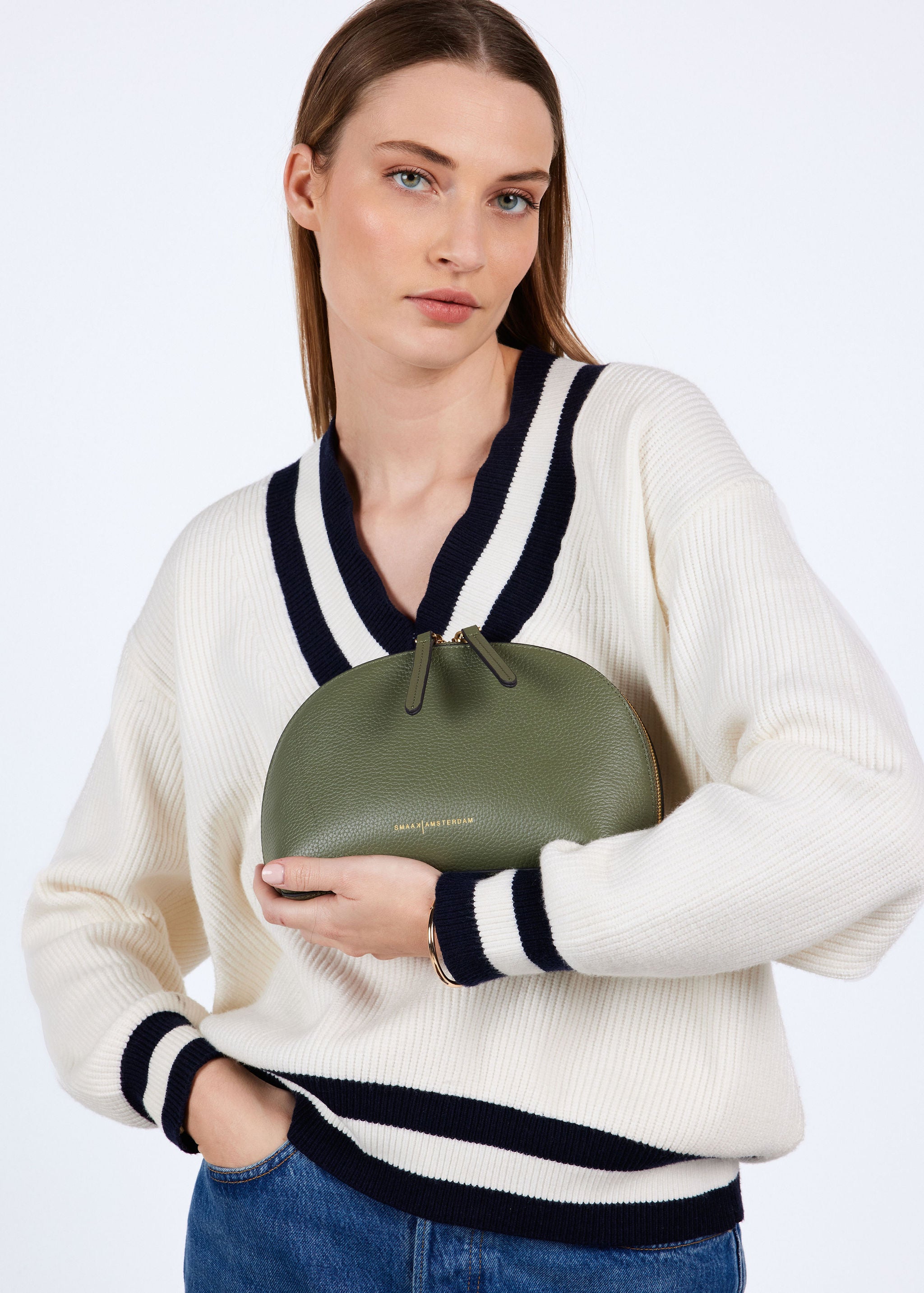 Ontdek onze luxe leren cosmetic case, ontworpen voor veelzijdigheid en stijl. Deze prachtige make-up tas kan ook dienen als clutch, extra binnentas, of toilettas. De binnenkant biedt extra functionaliteit met gescheiden binnenvakjes, perfect voor het opbergen van een mini spiegel en losse vakjes speciaal voor lippenstift, mascara en andere (make-up) eigendommen. Het interieur is gevoerd met zacht suedine (viscose) materiaal voor een luxe touch en extra bescherming van je items. De tas heeft een elegante ronde/halve maan vorm en is voorzien van een ritssluiting aan de bovenkant die aan beide kanten geopend kan worden, voor gemakkelijke toegang en een chique uitstraling. Deze cosmetic case combineert functionaliteit met verfijnde stijl, ideaal voor zowel dagelijks gebruik als reizen.