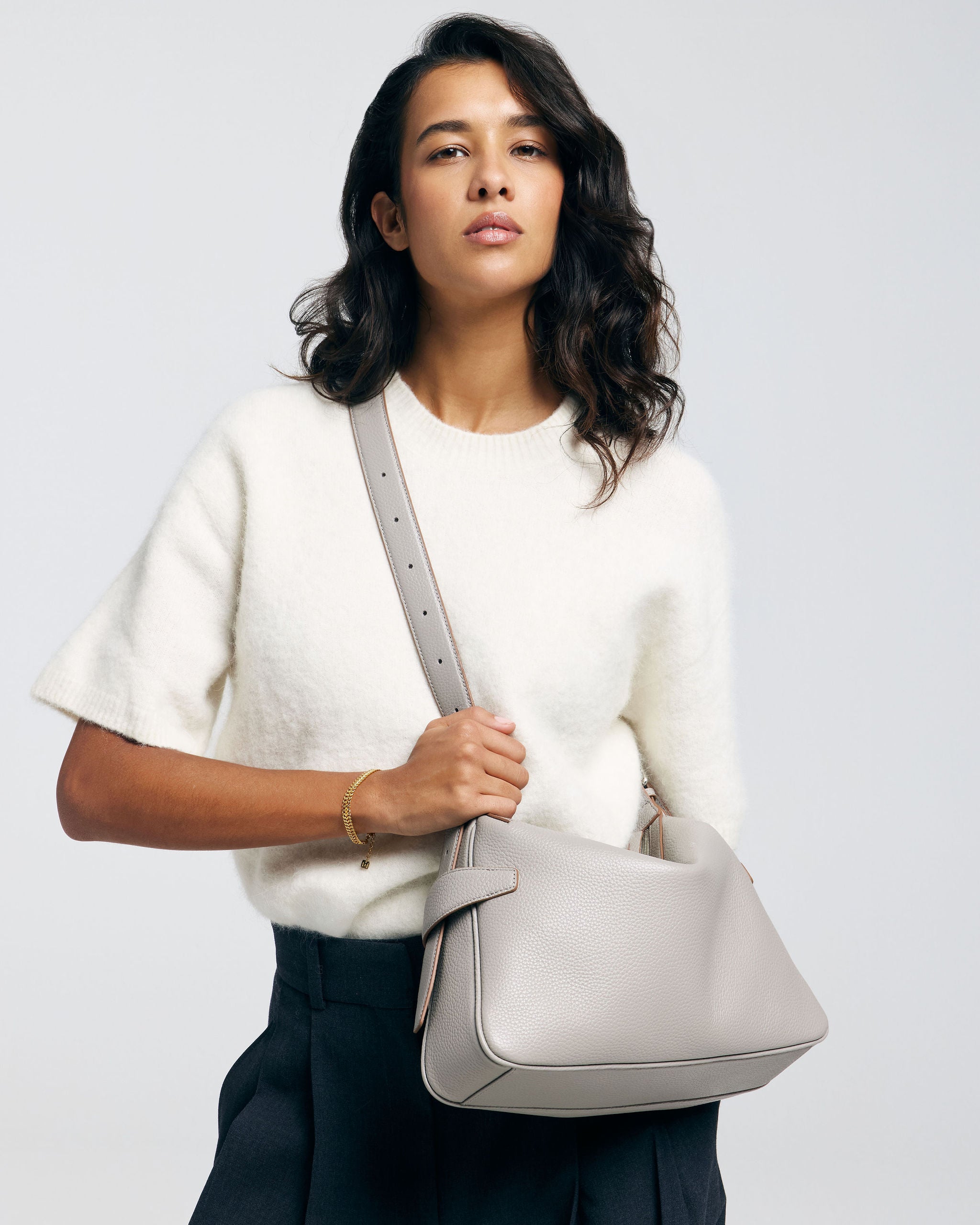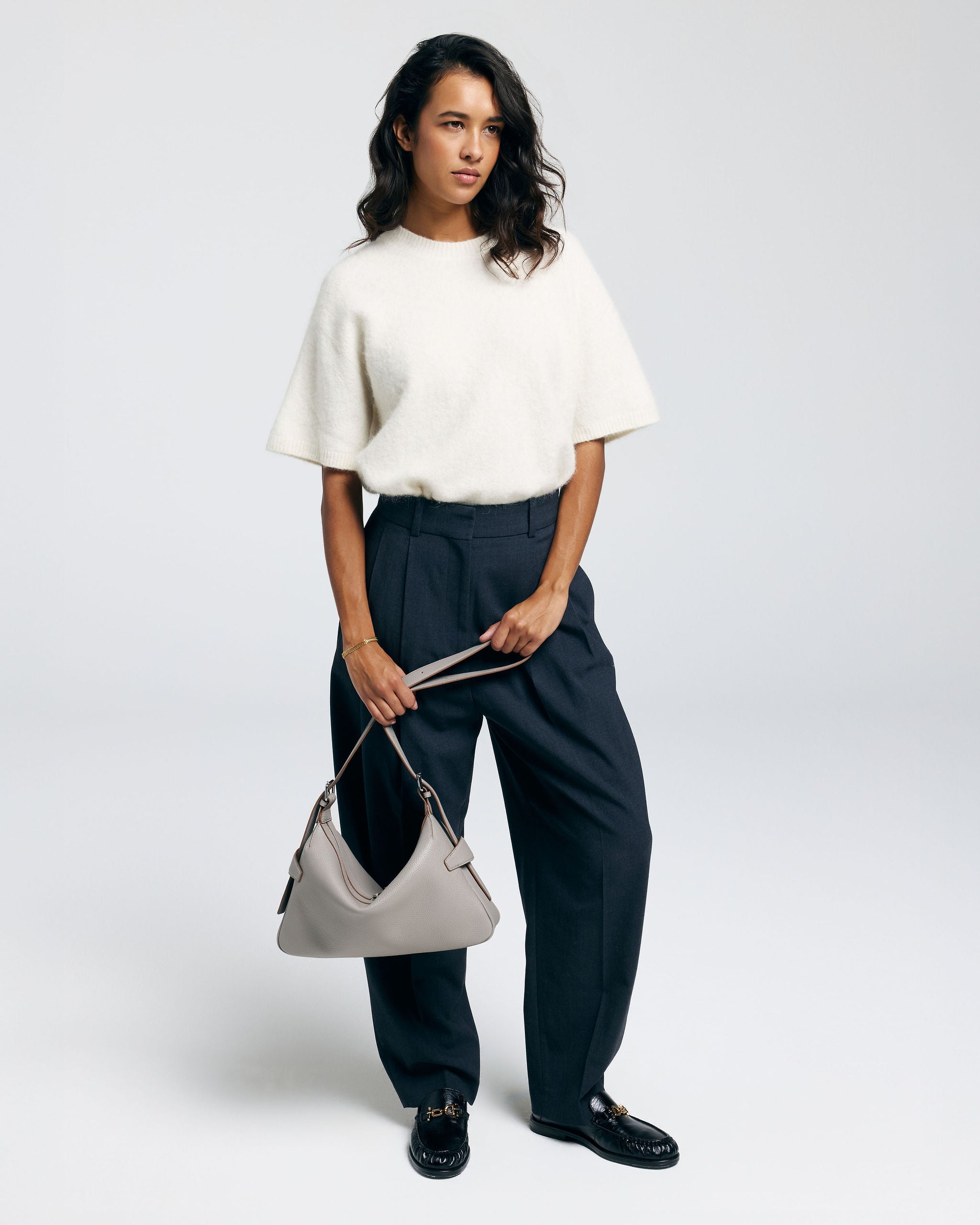 Een compacte schoudertas met een zachte, moderne vorm en een nonchalante valling. Het slanke silhouet ligt mooi tegen het lichaam en maakt de tas geschikt voor elke dag.