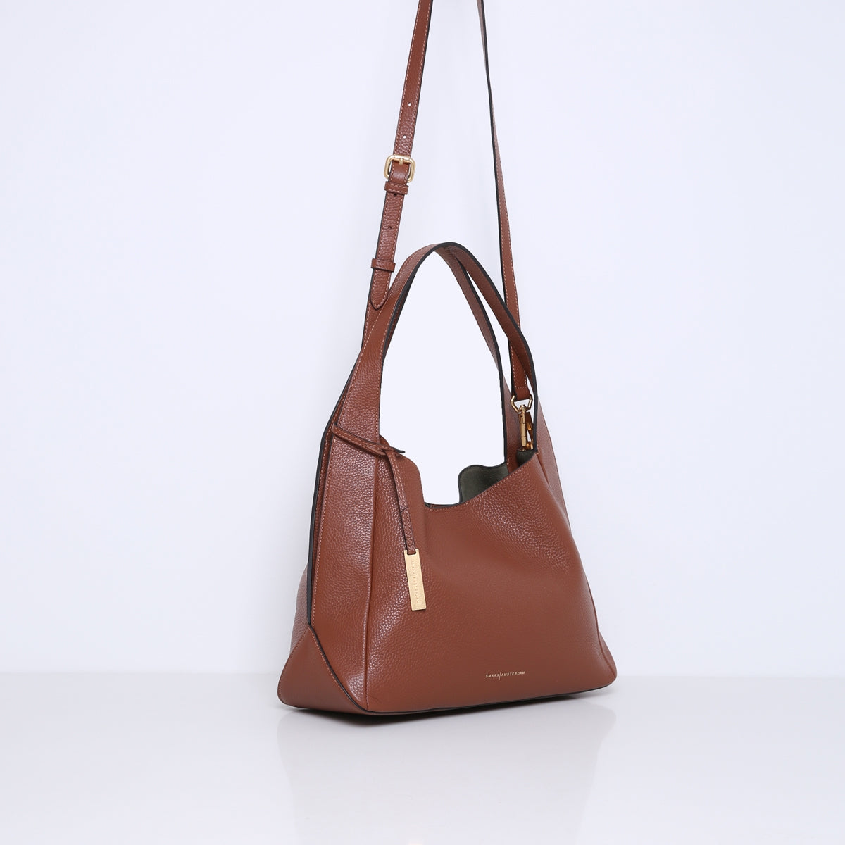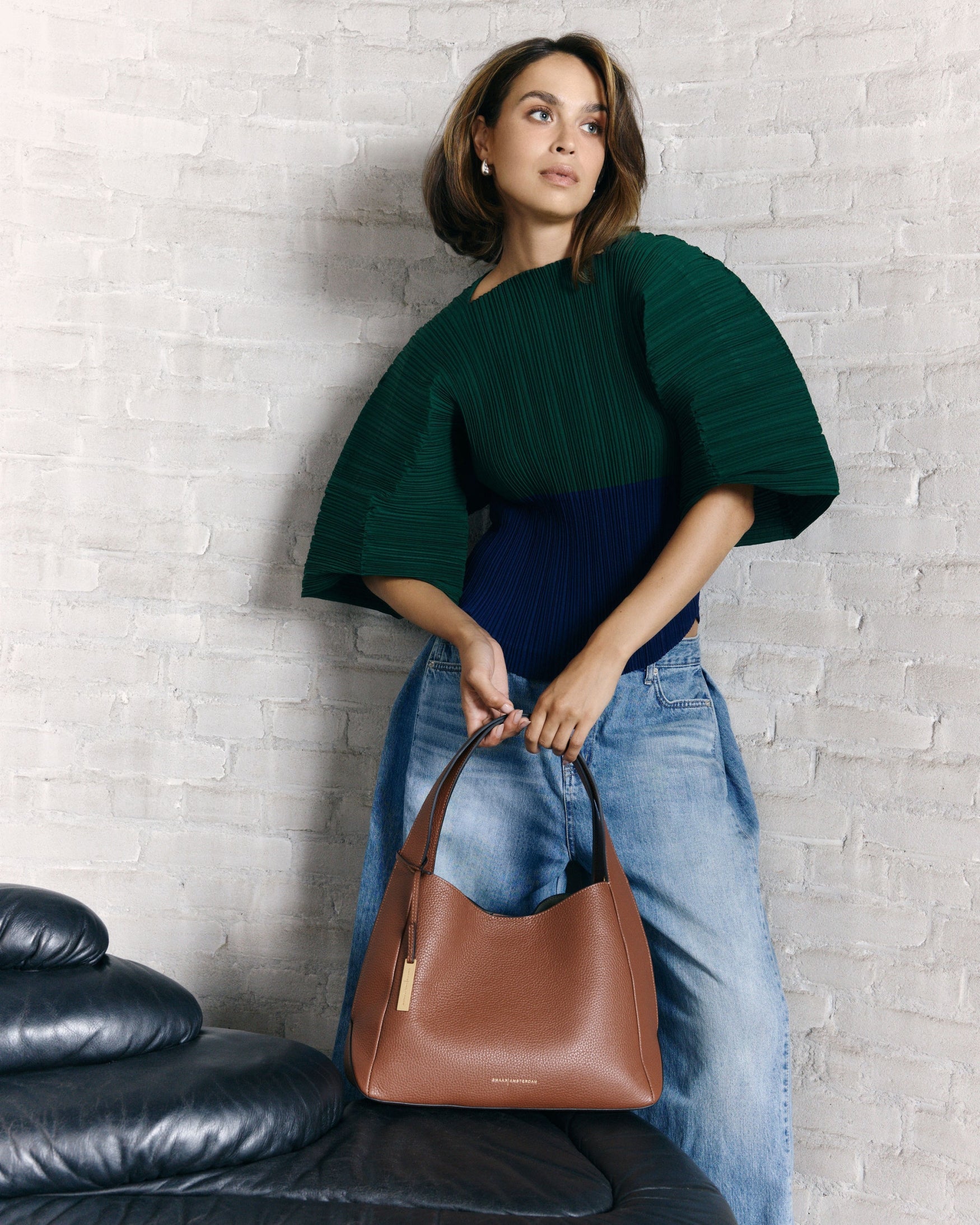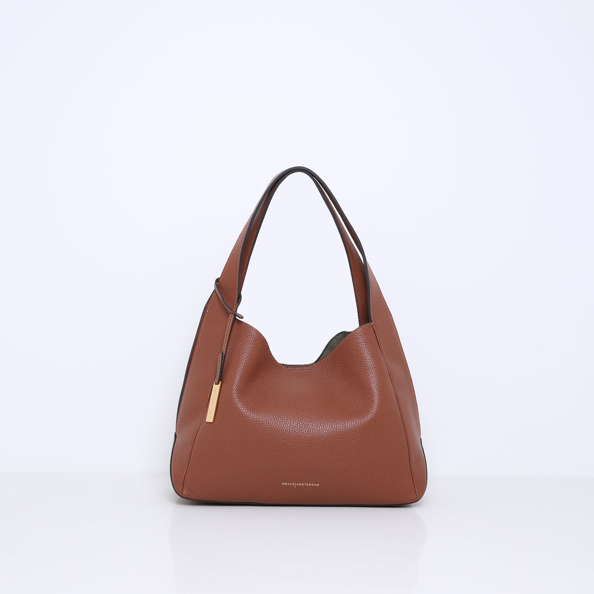 De handtas heeft twee stevige leren hengsels die naadloos overgaan aan de zijkanten van de tas en daar eindigen in een stijlvolle split. Deze splits voegen niet alleen een verfijnd detail toe, maar zorgen ook voor extra flexibiliteit en comfort bij het dragen. Dit grote model is perfect voor dagelijks gebruik, met voldoende ruimte voor al je essentiële spullen inclusief een 13 Inch laptop zonder hoes. De tas kan zowel in de hand als crossbody gedragen worden dankzij een afneembare en verstelbare schouderriem.