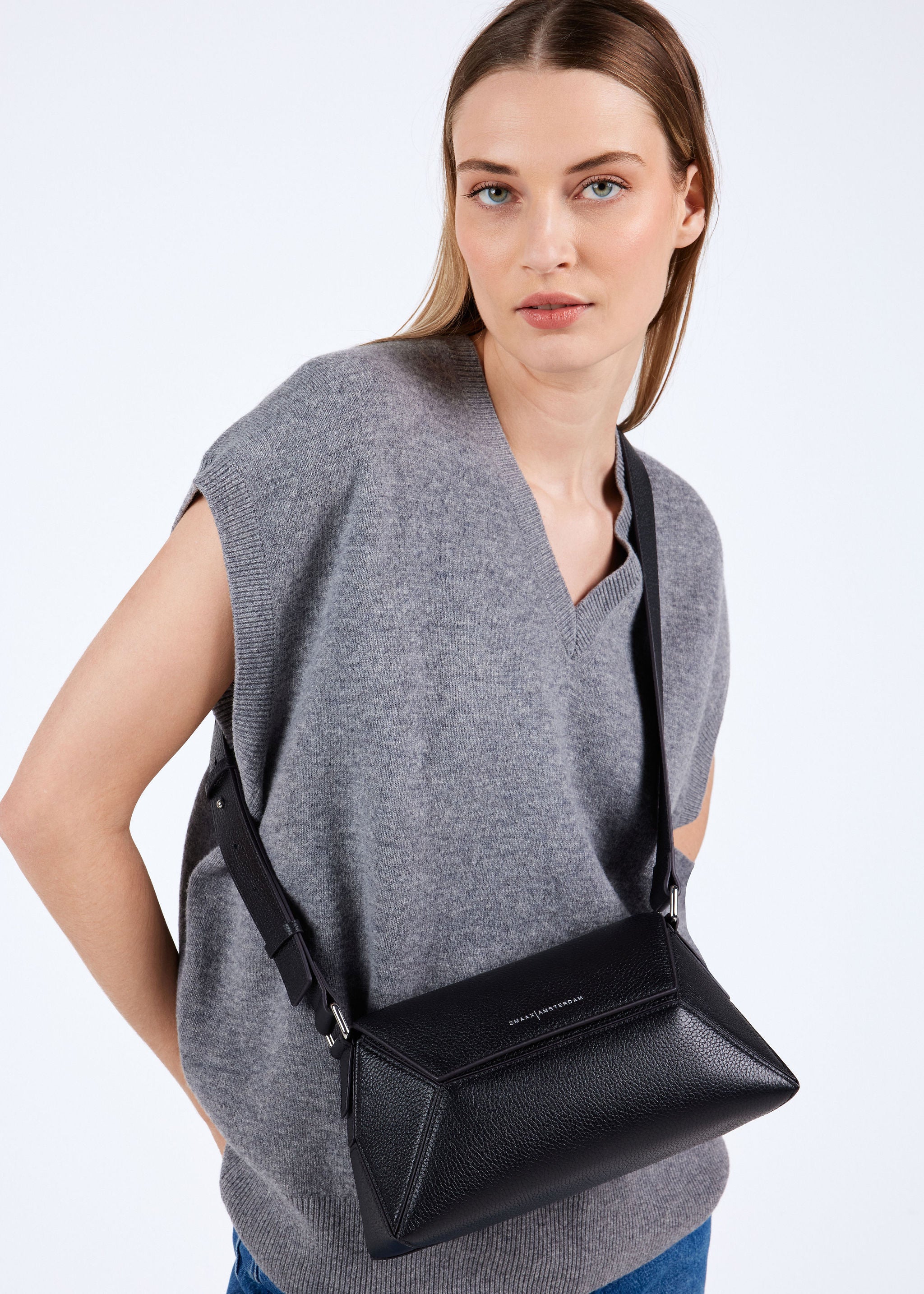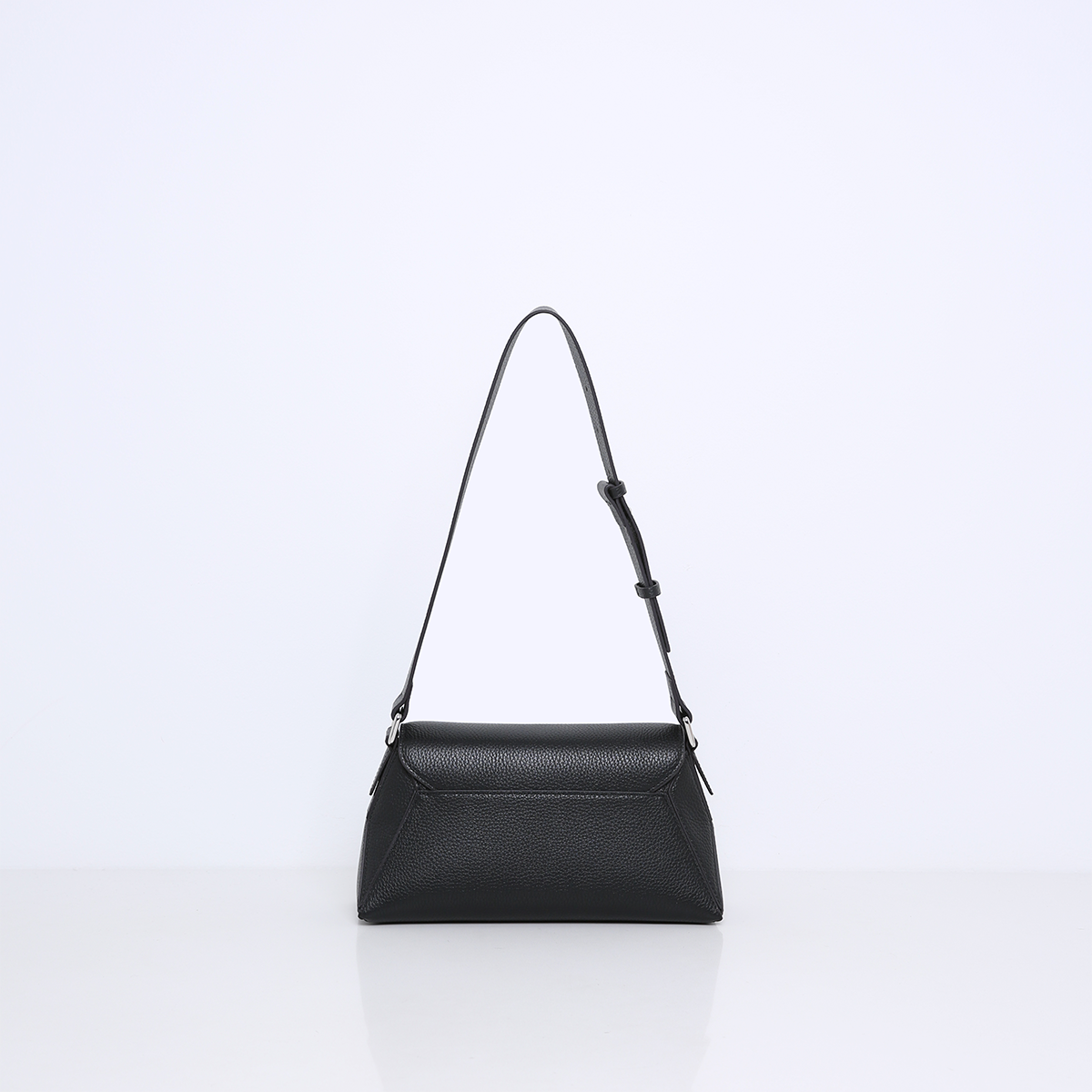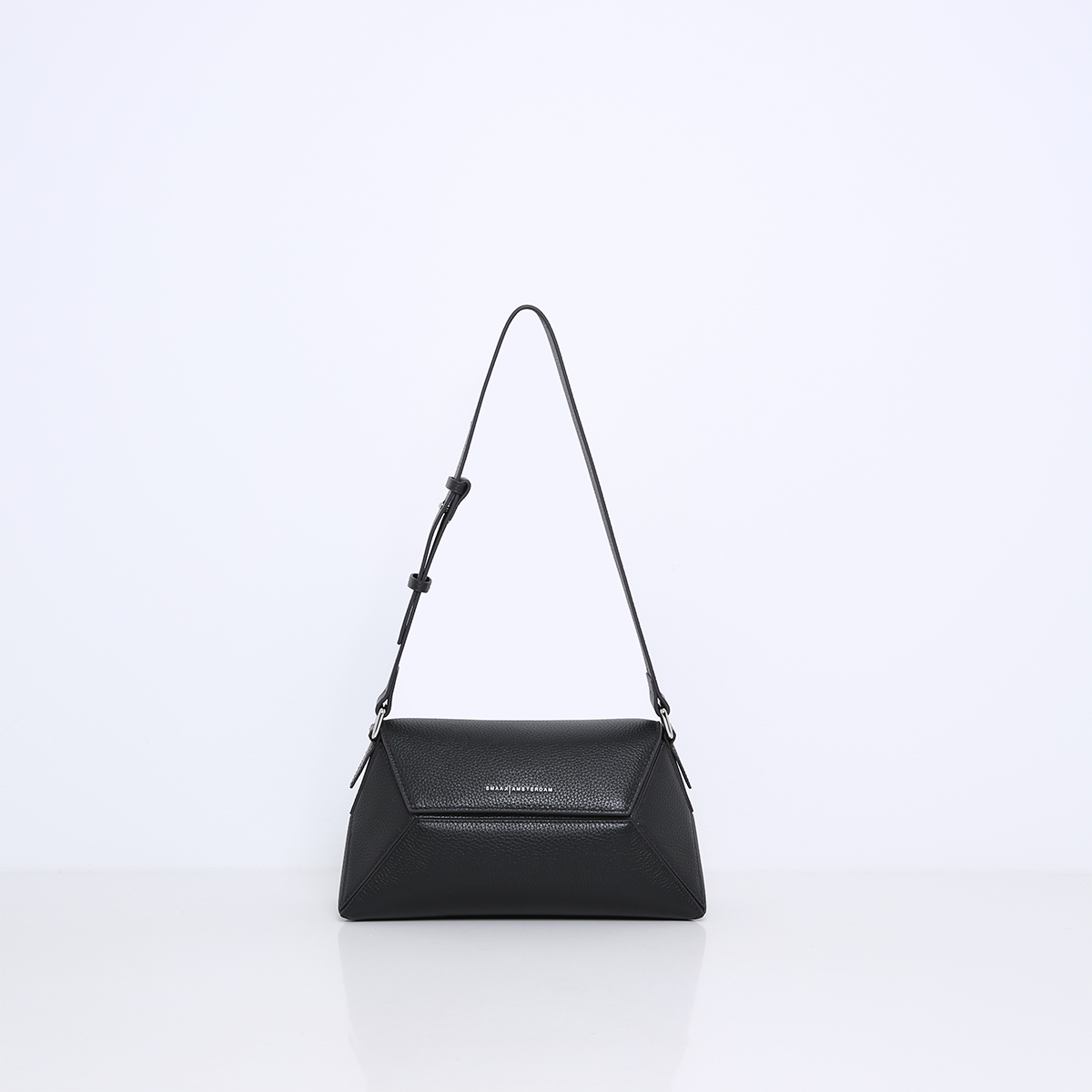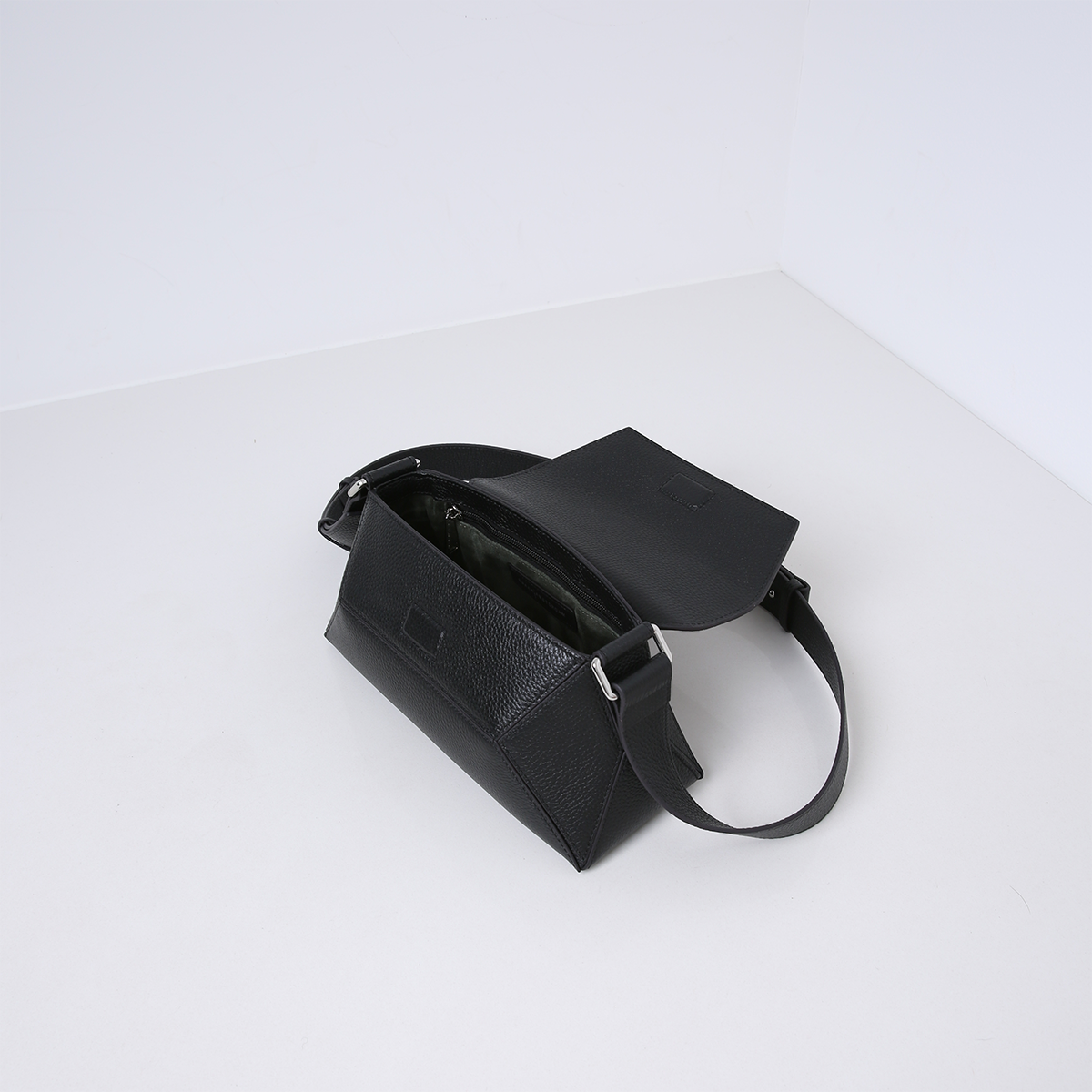 Het stevige, rechthoekige model is breed maar compact genoeg om elegant te dragen, of je hem nu over je schouder hangt of in de hand houdt. De tas heeft een interessante puzzelachtige uitstraling door de lijnen in het leer, wat het ontwerp een modern en verfijnd karakter geeft. De bovenkant opent met een onzichtbare magneetsluiting, wat zorgt voor een strakke en gestroomlijnde afwerking.