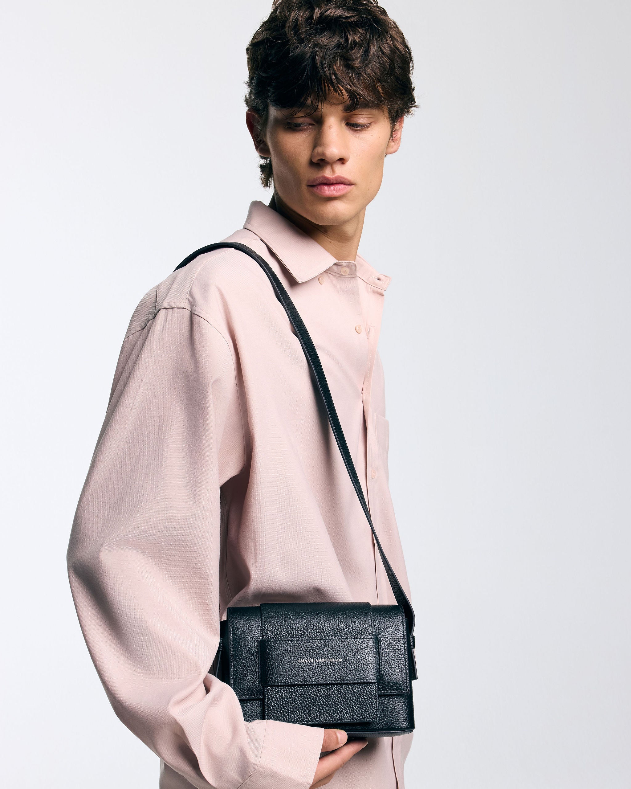 Gemaakt van luxueus zacht rundleer, opent de tas met een voorflap die is voorzien van een magnetische sluiting. De vaste schouderband is verstelbaar met subtiele drukknoopjes, zodat je hem op maat kunt dragen. Binnenin vind je meerdere handige vakjes, afgewerkt met een zachte suedine voering voor een luxueuze touch.