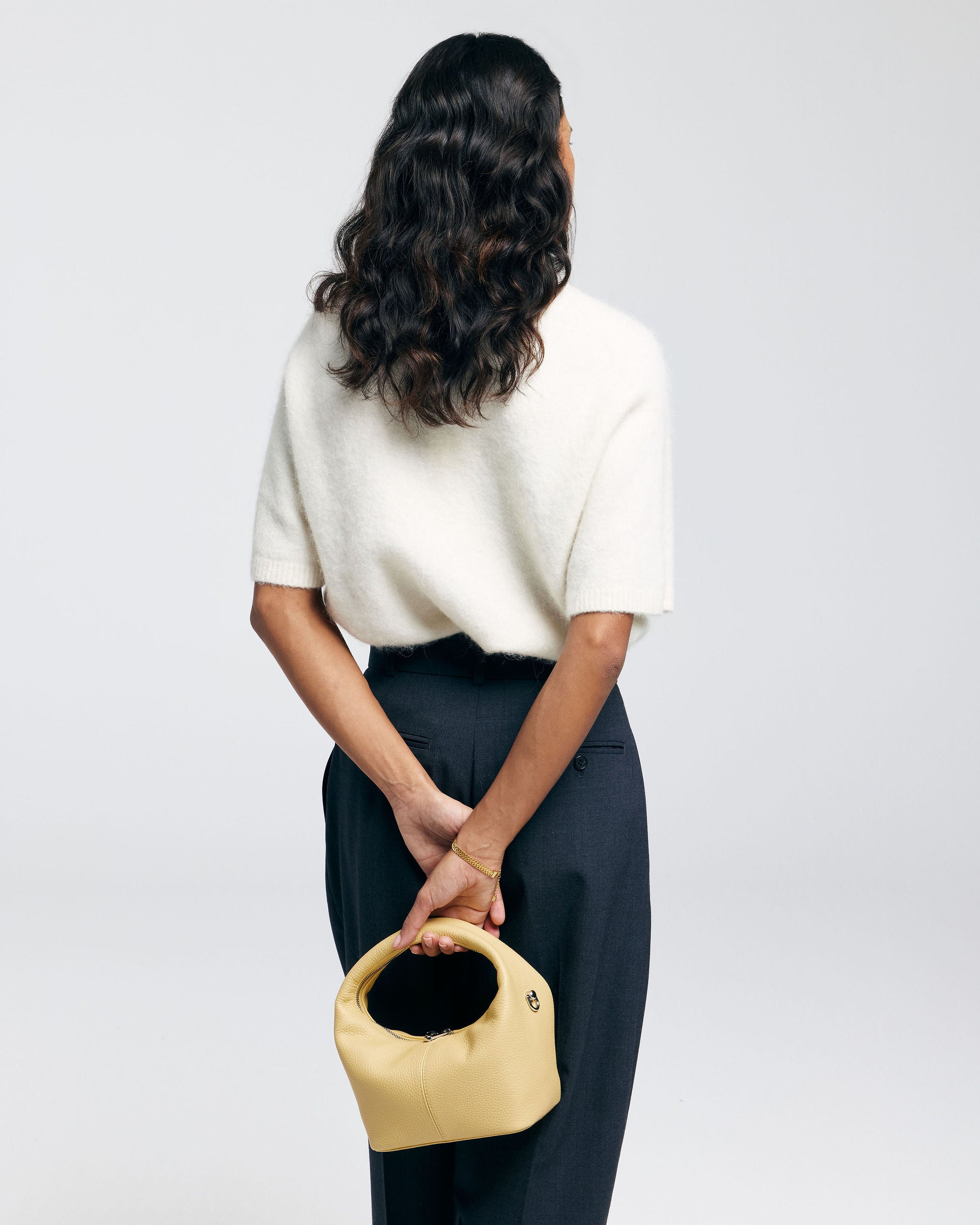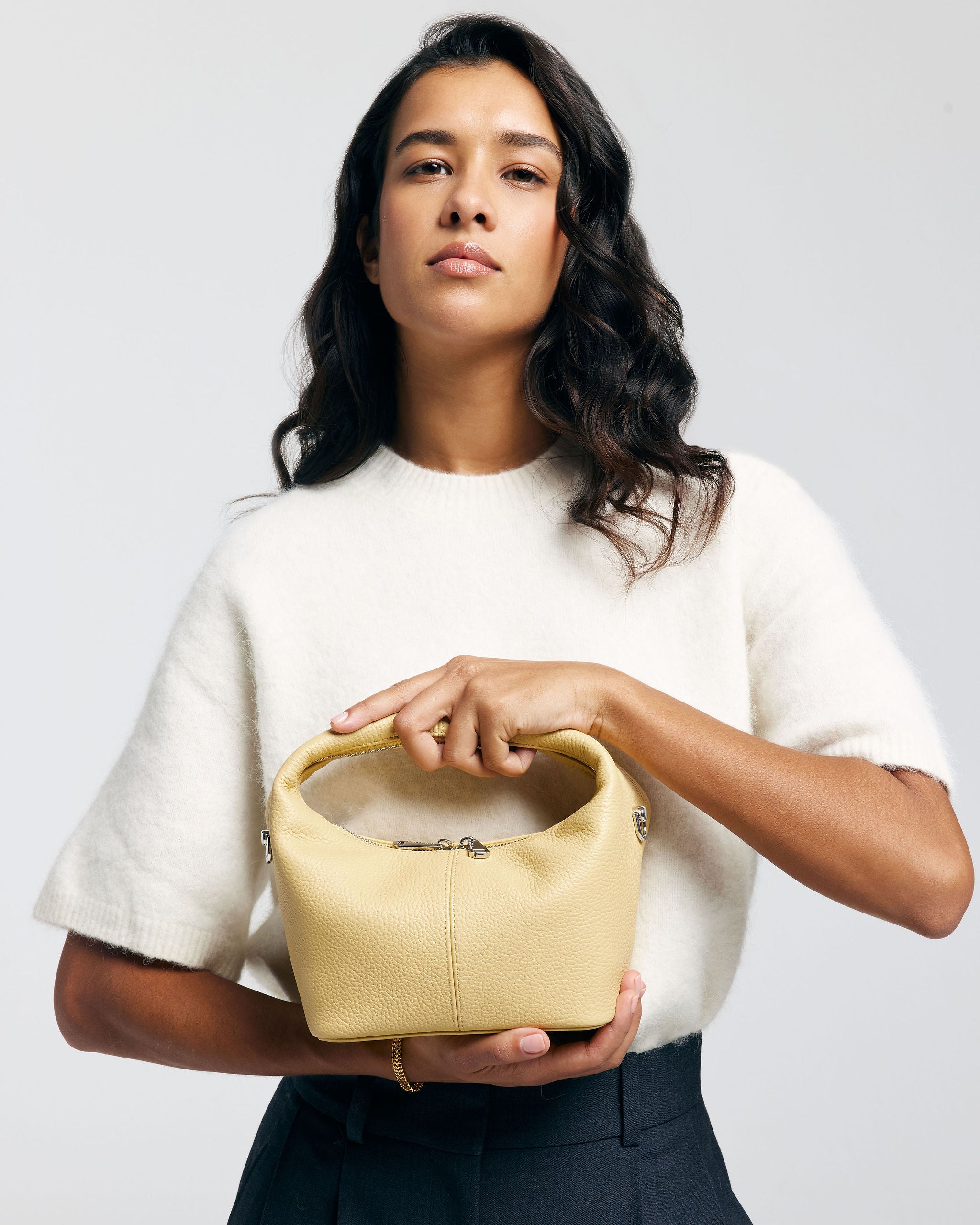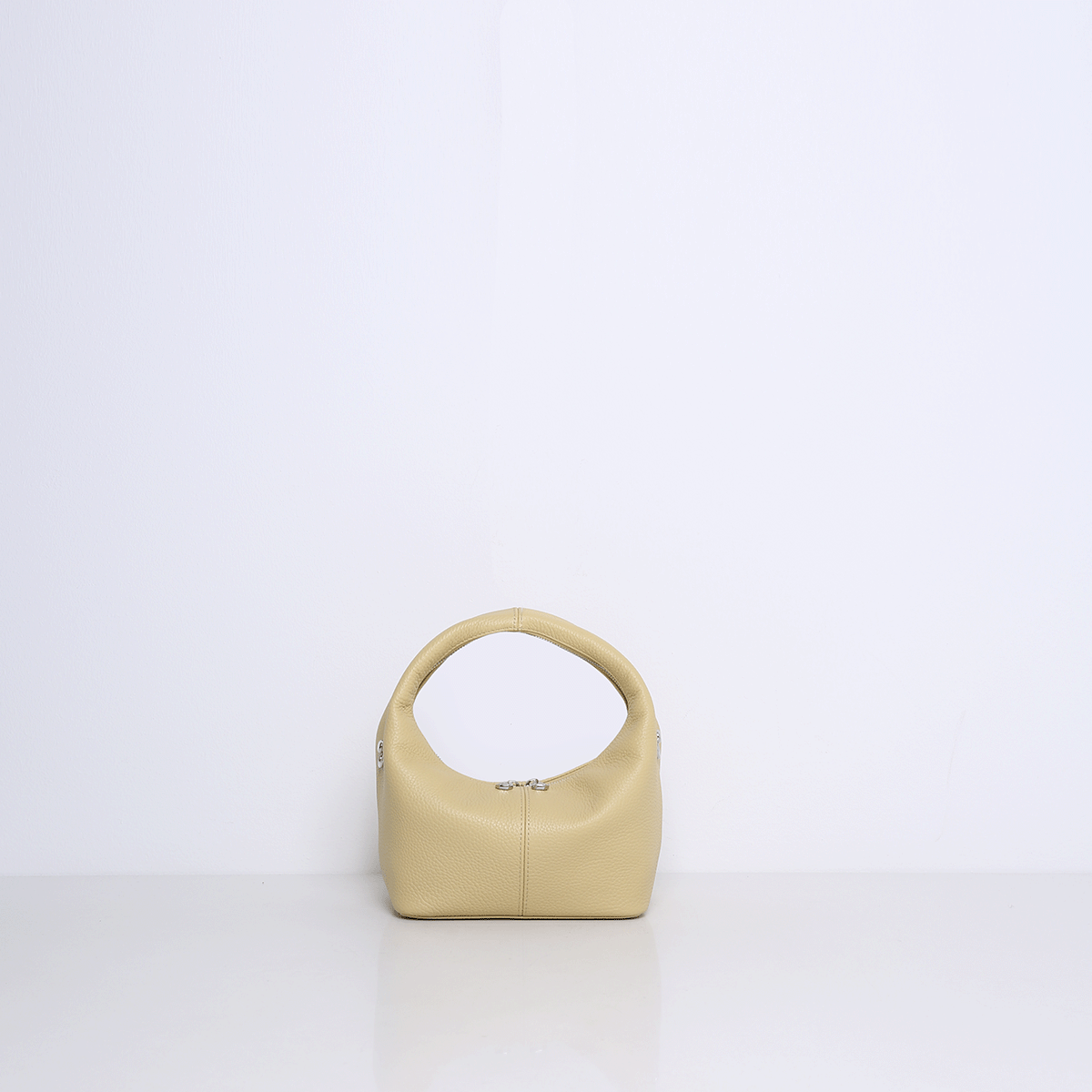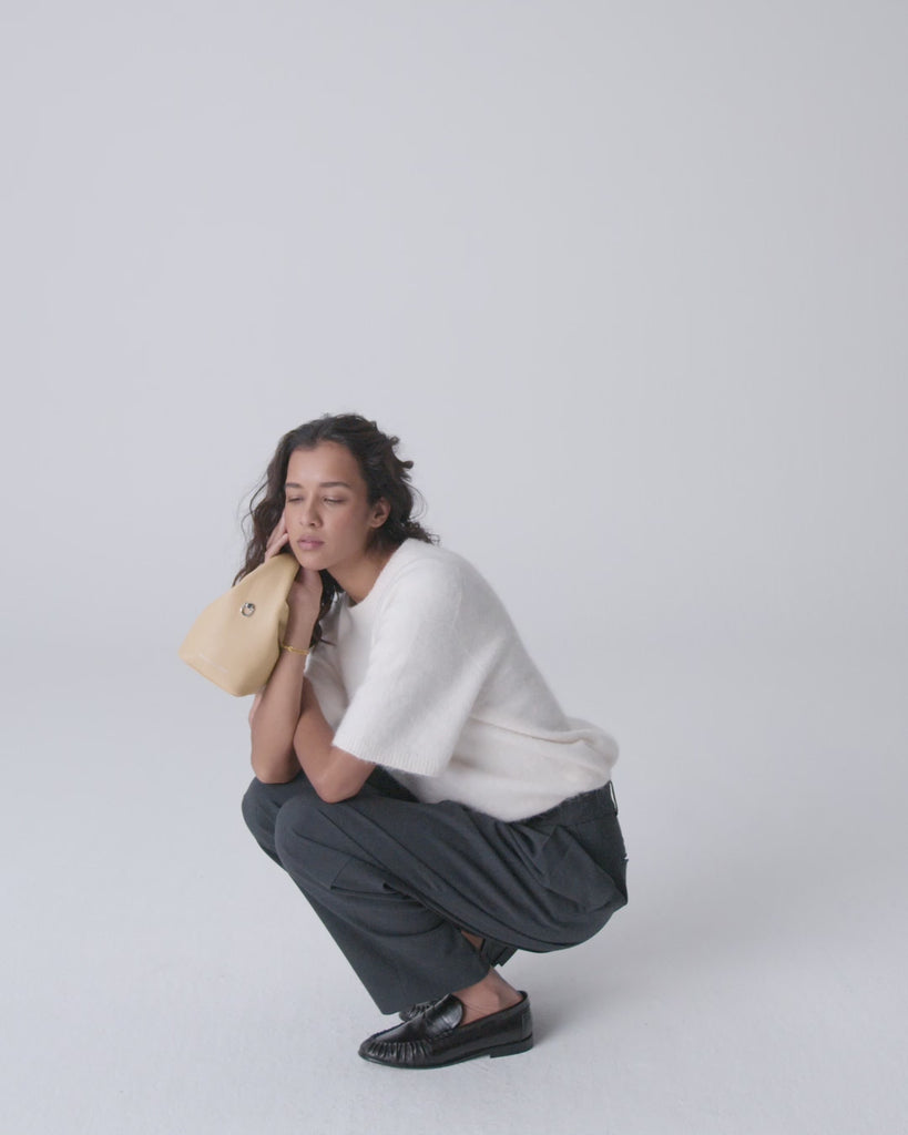 De SHELBY is een compacte mini tote bag met een onderscheidend design. De tas valt op door haar ronde, halfronde vorm en het brede leren handvat. Het leer voelt soepel en licht aan, waardoor de tas comfortabel in de hand ligt.