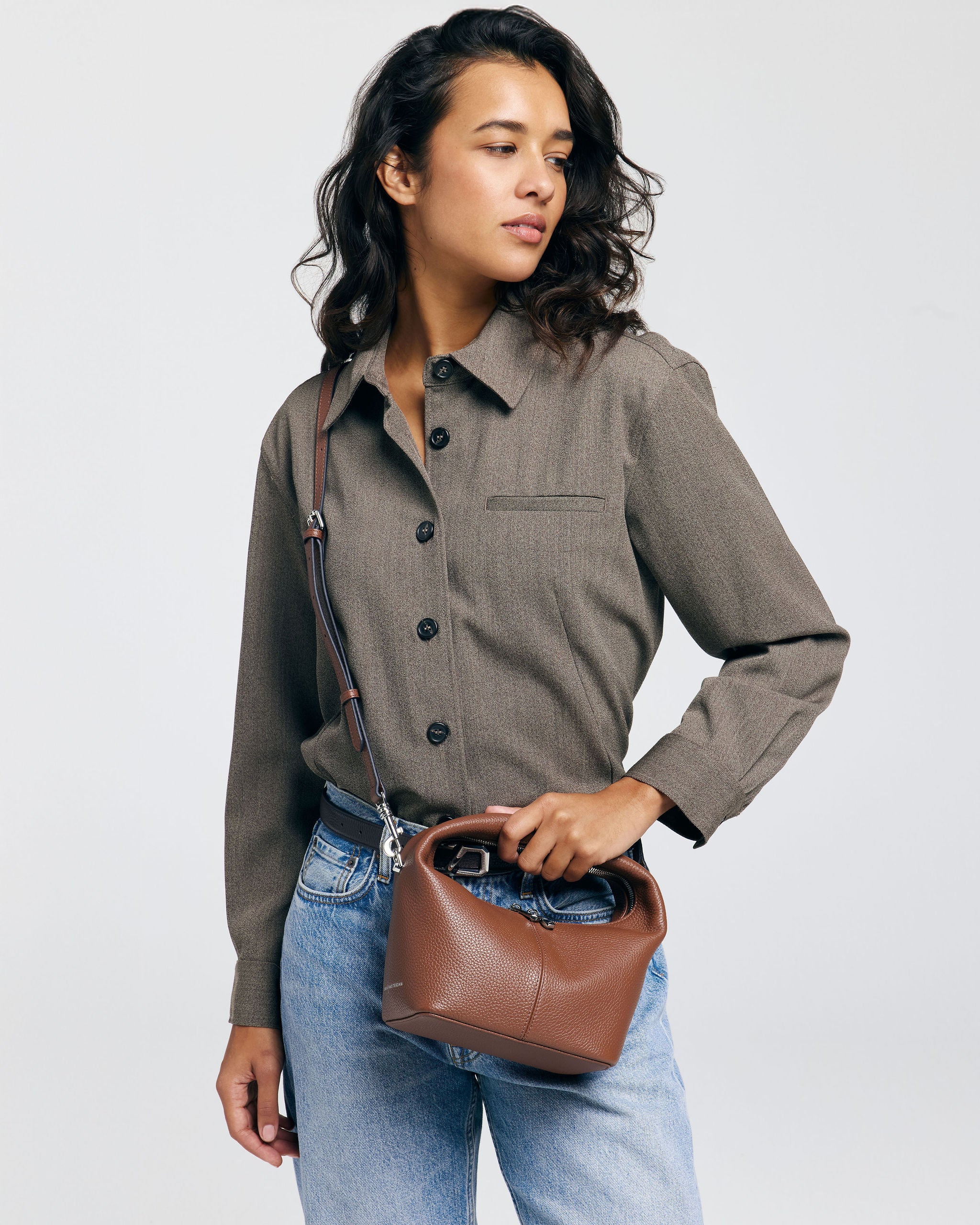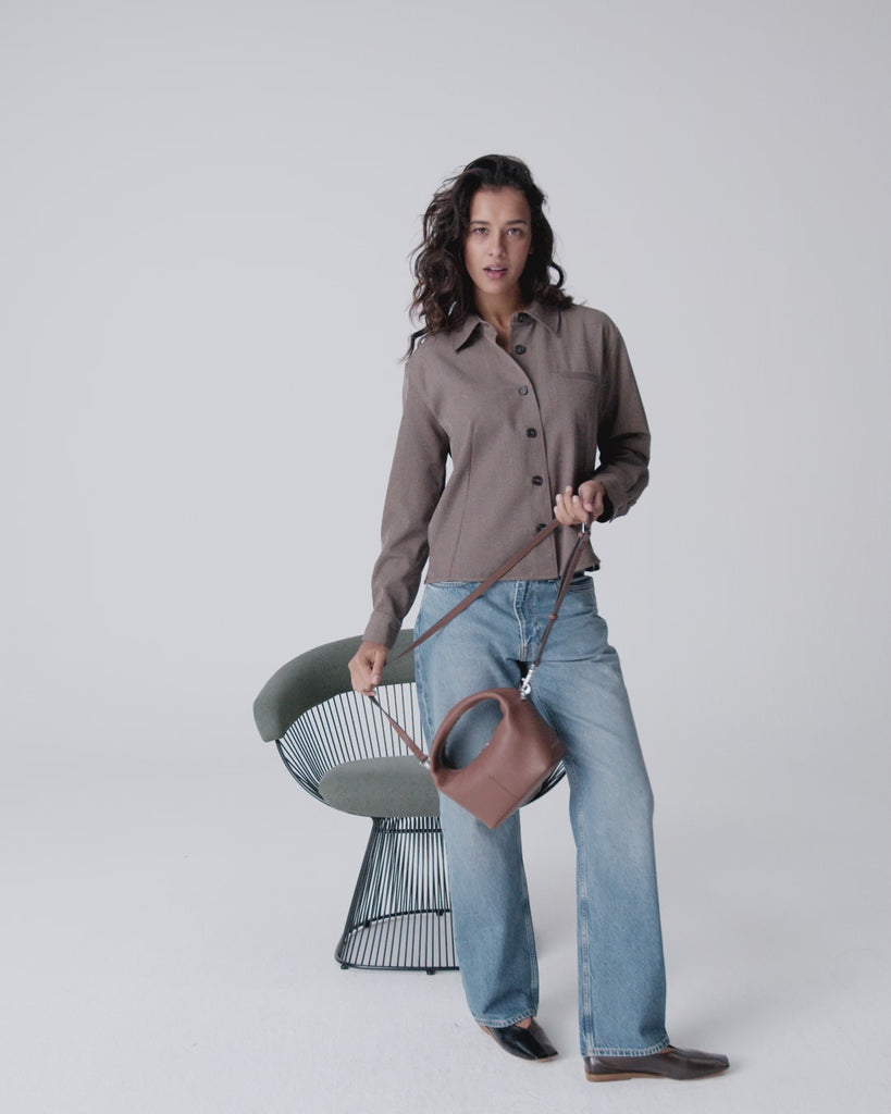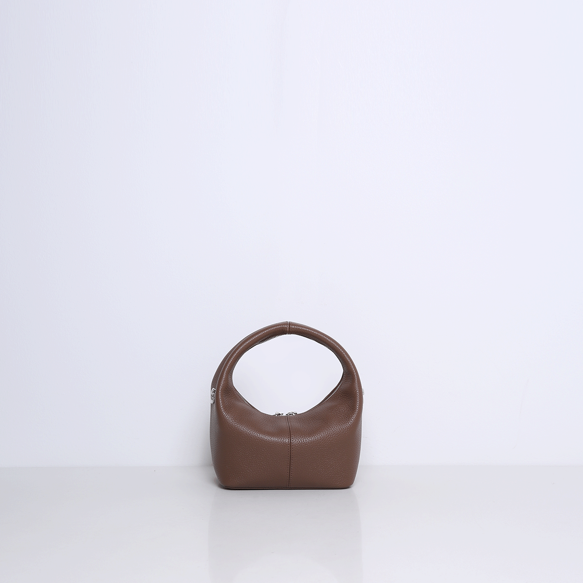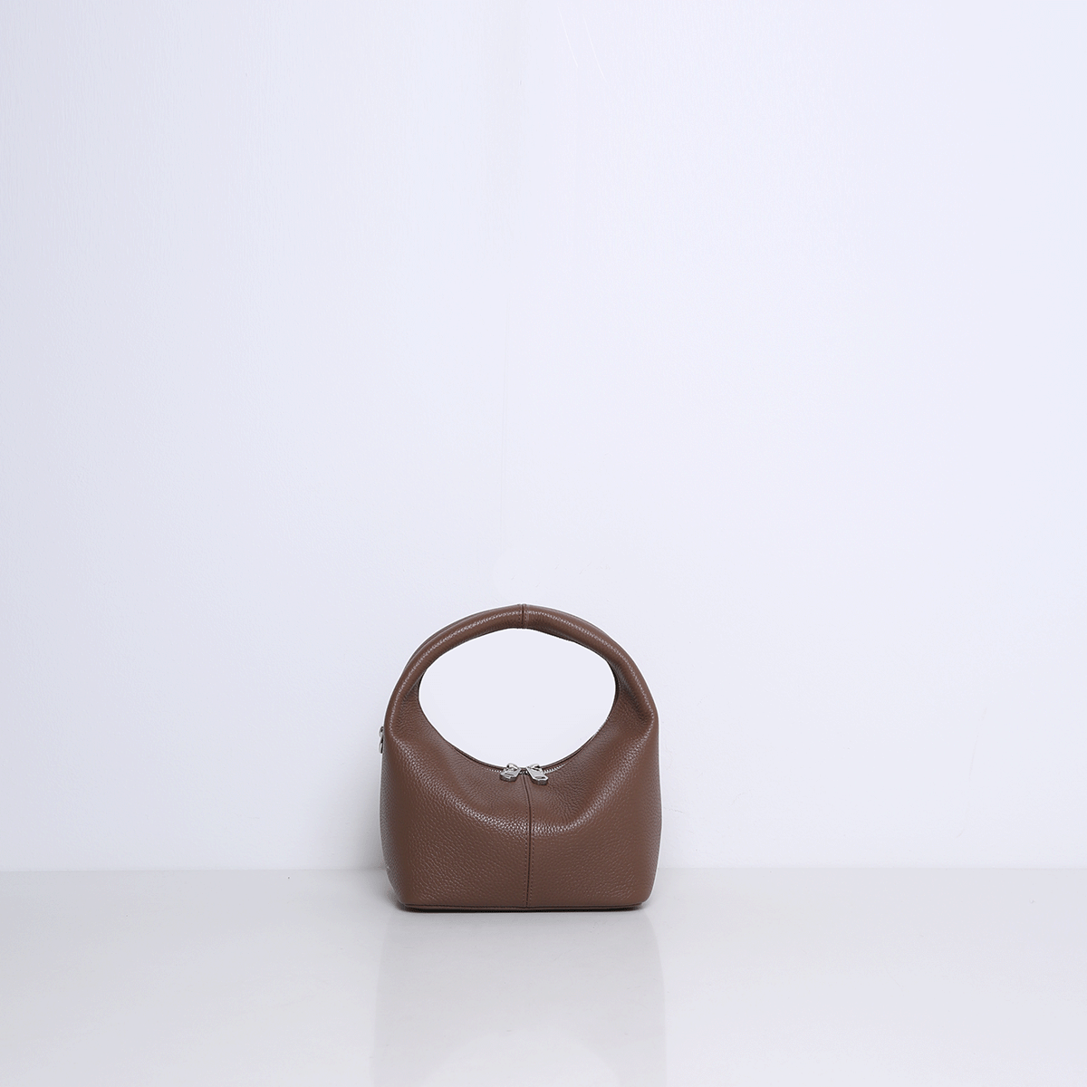De SHELBY is een compacte mini tote bag met een onderscheidend design. De tas valt op door haar ronde, halfronde vorm en het brede leren handvat. Het leer voelt soepel en licht aan, waardoor de tas comfortabel in de hand ligt.
