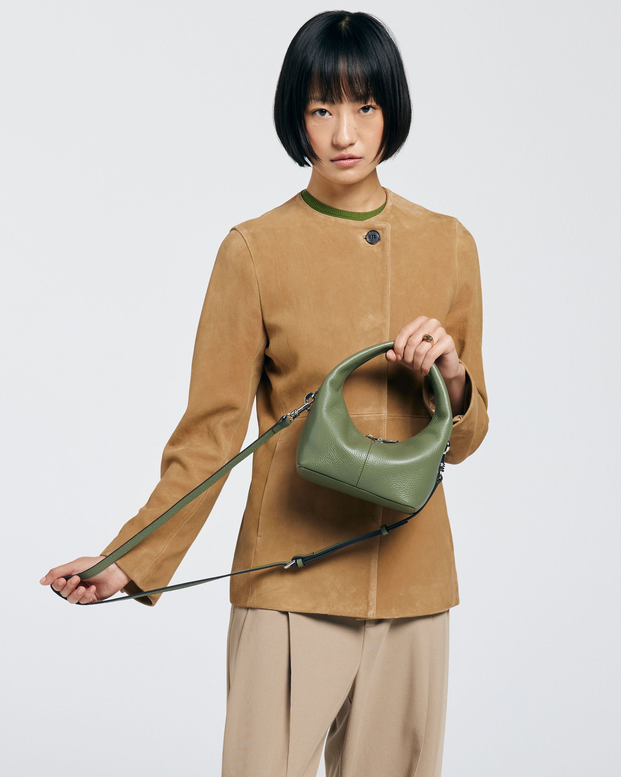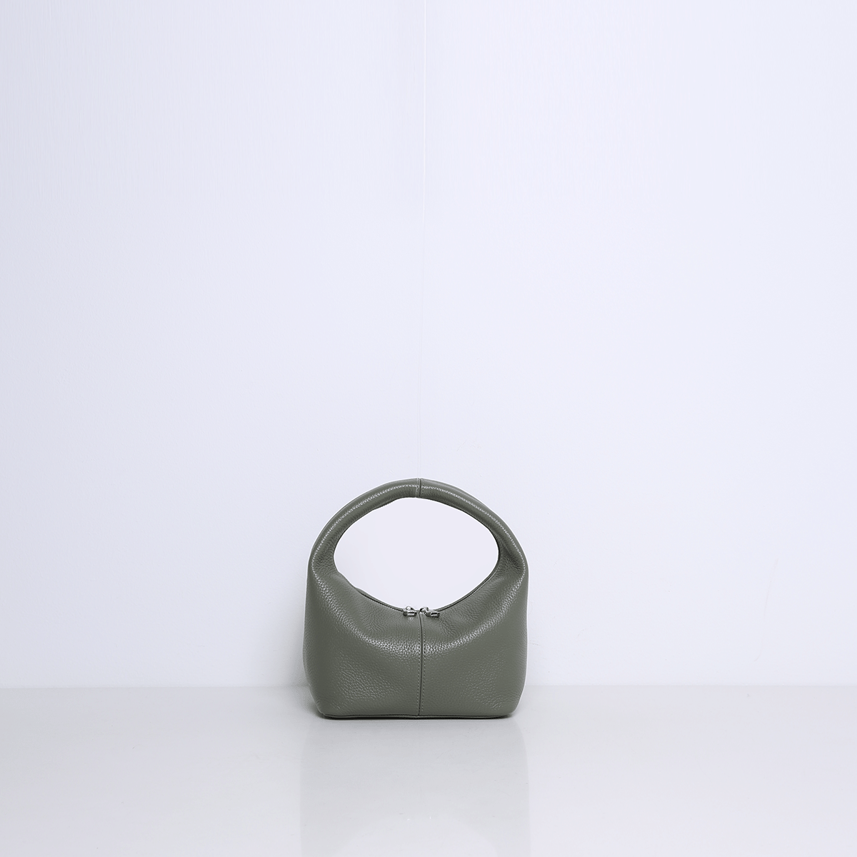 De SHELBY is een compacte mini tote bag met een onderscheidend design. De tas valt op door haar ronde, halfronde vorm en het brede leren handvat. Het leer voelt soepel en licht aan, waardoor de tas comfortabel in de hand ligt.