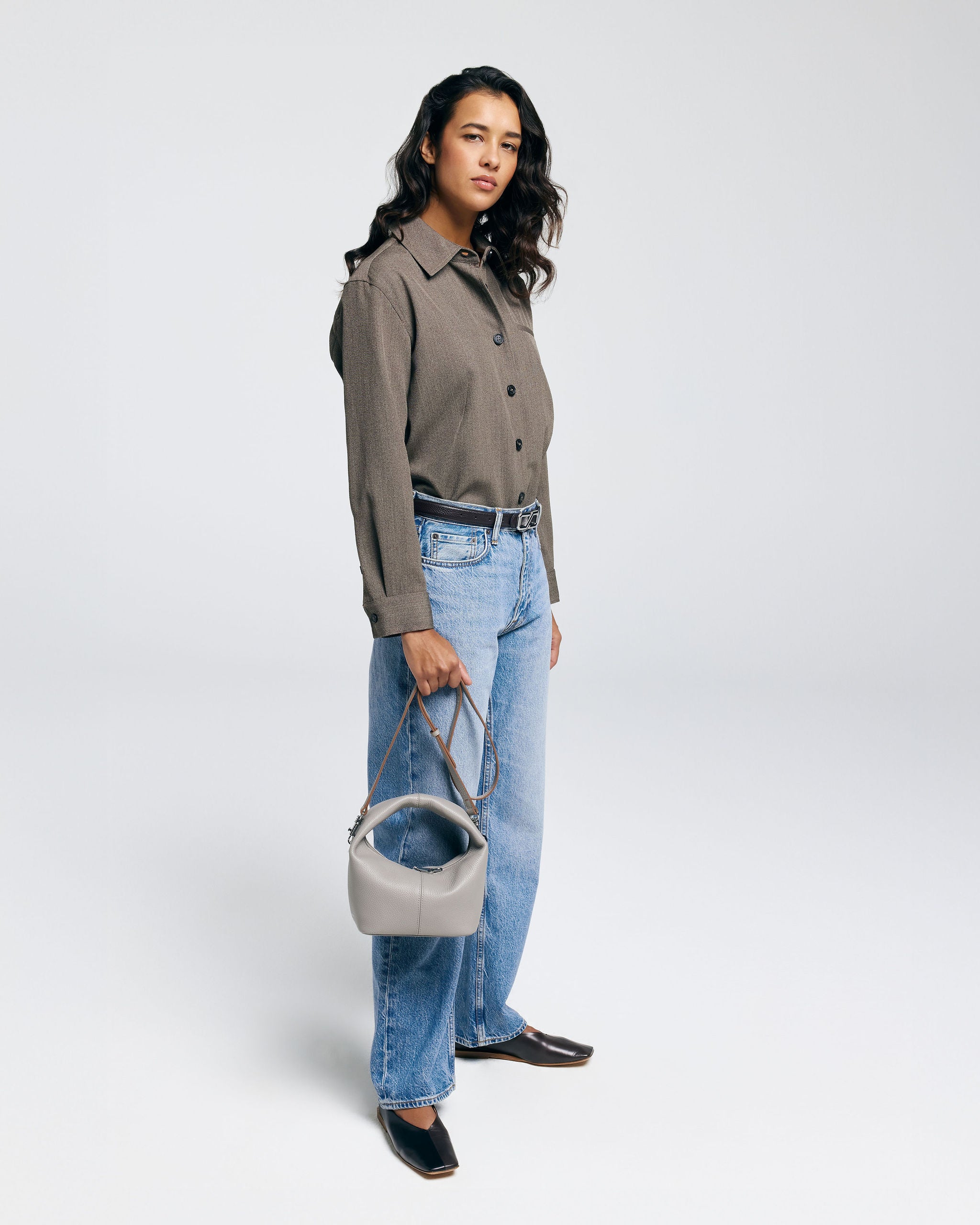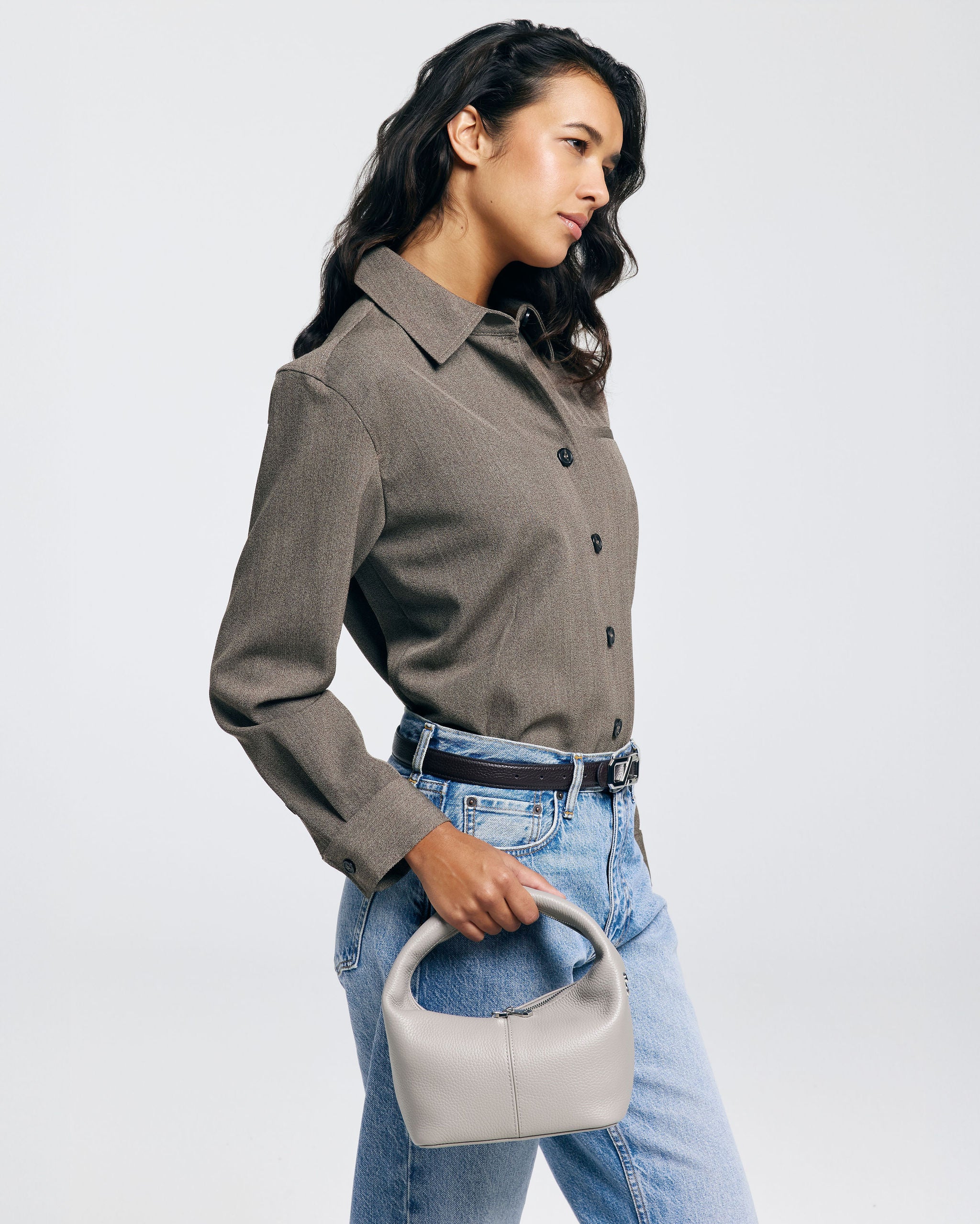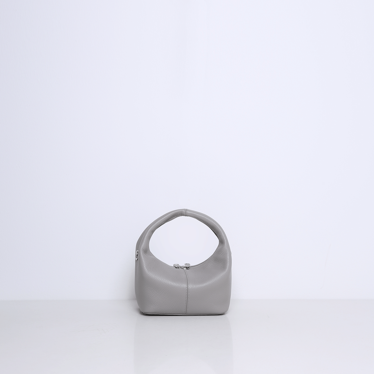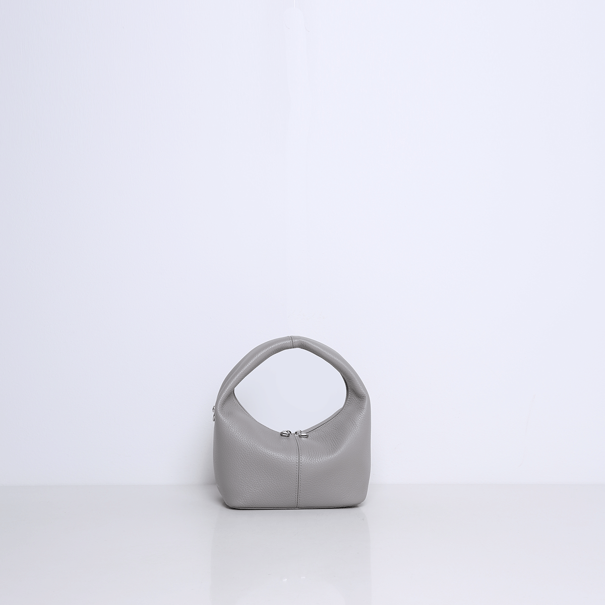 De SHELBY is een compacte mini tote bag met een onderscheidend design. De tas valt op door haar ronde, halfronde vorm en het brede leren handvat. Het leer voelt soepel en licht aan, waardoor de tas comfortabel in de hand ligt.